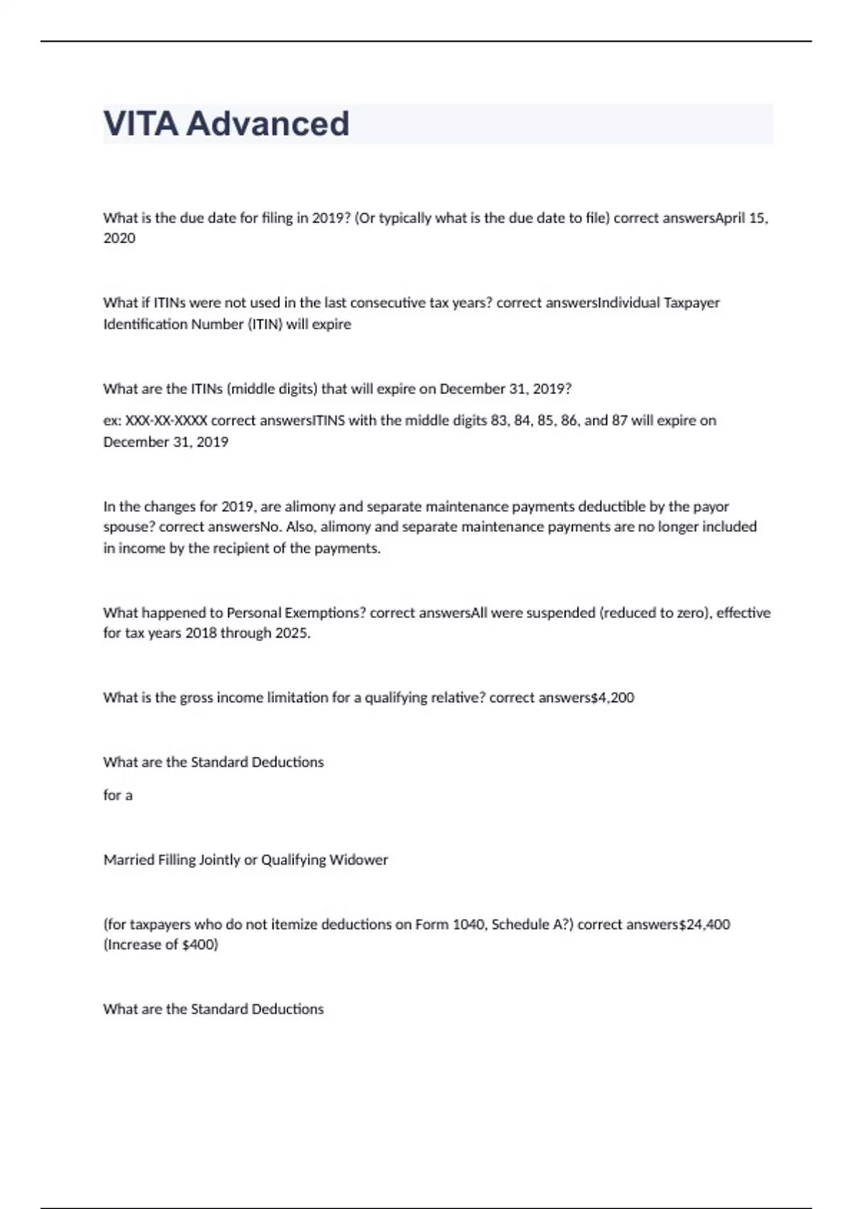 What is the due date for filing in 2019? (Or typically what is the due date to file) correct answersApril 15, 2020 What if ITINs were not used in the last consecutive tax years? correct answersIndividual Taxpayer Identification Number (ITIN) will expire What are the ITINs (middle digits) that will expire on December 31, 2019? ex: XXX-XX-XXXX correct answersITINS with the middle digits 83, 84, 85, 86, and 87 will expire on December 31, 2019 In the changes for 2019, are alimony and separate maintenance payments deductible by the payor spouse? correct answersNo. Also, alimony and separate maintenance payments are no longer included in income by the recipient of the payments. What happened to Personal Exemptions? correct answersAll were suspended (reduced to zero), effective for tax years 2018 through 2025. What is the gross income limitation for a qualifying relative? correct answers$4,200 What are the Standard Deductions for a Married Filling Jointly or Qualifying Widower (for taxpayers who do not itemize deductions on Form 1040, Schedule A?) correct answers$24,400 (Increase of $400) What are the Standard Deductions