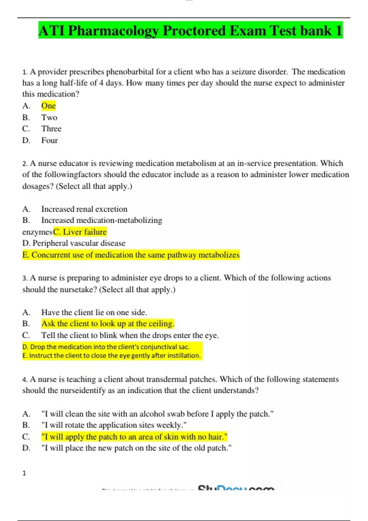 ATI Pharmacology Proctored Exam Test bank 1 1. A provider prescribes phenobarbital for a client who has a seizure disorder. The medication has a long half-life of 4 days. How many times per day should the nurse expect to administer this medication? A. One B. Two C. Three D. Four 2. A nurse educator is reviewing medication metabolism at an in-service presentation. Which of the followingfactors should the educator include as a reason to administer lower medication dosages? (Select all that apply.) A. Increased renal excretion B. Increased medication-metabolizing enzymesC. Liver failure D. Peripheral vascular disease E. Concurrent use of medication the same pathway metabolizes 3. A nurse is preparing to administer eye drops to a client. Which of the following actions should the nursetake? (Select all that apply.) A. Have the client lie on one side. B. Ask the client to look up at the ceiling. C. Tell the client to blink when the drops enter the eye. 4. A nurse is teaching a client about transdermal patches. Which of the following statements should the nurseidentify as an indication that the client understands? A. "I will clean the site with an alcohol swab before I apply the patch." B. "I will rotate the application sites weekly." C. "I will apply the patch to an area of skin with no hair." D. "I will place the new patch on the site of the old patch." 1 lOMoAR cPSD| Downloaded by Valenzuela Tablet () 5. A nurse reviewing a client's medical record notes a new prescription for verifying the trough level of theclient's medication. Which of the following actions should the nurse take? A. Obtain a blood specimen immediately prio
