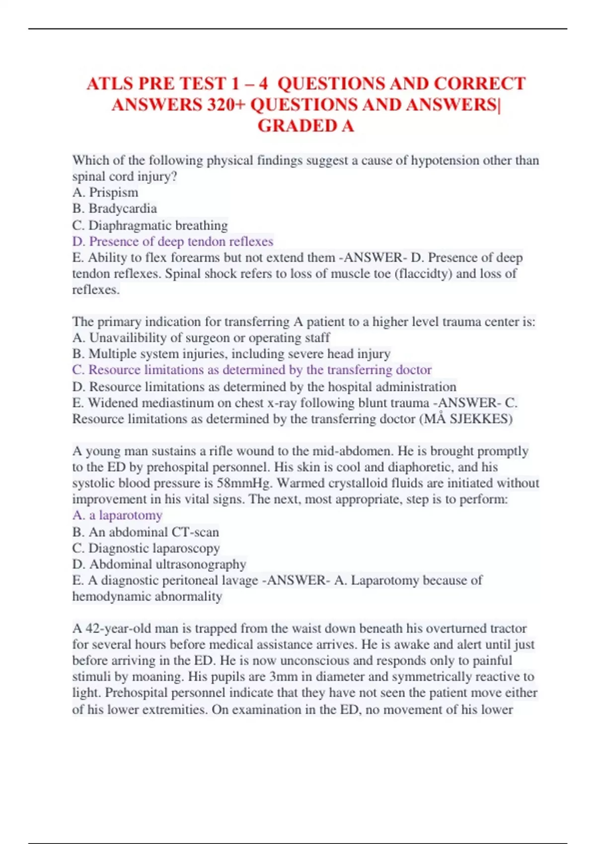 ATLS PRE TEST 1 – 4 QUESTIONS AND CORRECT ANSWERS 320+ QUESTIONS AND ANSWERS| GRADED A Which of the following physical findings suggest a cause of hypotension other than spinal cord injury? A. Prispism B. Bradycardia C. Diaphragmatic breathing D. Presence of deep tendon reflexes E. Ability to flex forearms but not extend them -ANSWER- D. Presence of deep tendon reflexes. Spinal shock refers to loss of muscle toe (flaccidty) and loss of reflexes. The primary indication for transferring A patient to a higher level trauma center is: A. Unavailibility of surgeon or operating staff B. Multiple system injuries, including severe head injury C. Resource limitations as determined by the transferring doctor D. Resource limitations as determined by the hospital administration E. Widened mediastinum on chest x-ray following blunt trauma -ANSWER- C. Resource limitations as determined by the transferring doctor (MÅ SJEKKES) A young man sustains a rifle wound to the mid-abdomen. He is brought promptly to the ED by prehospital personnel. His skin is cool and diaphoretic, and his systolic blood pressure is 58mmHg. Warmed crystalloid fluids are initiated without improvement in his vital signs. The next, most appropriate, step is to perform: A. a laparotomy B. An abdominal CT-scan C. Diagnostic laparoscopy D. Abdominal ultrasonography E. A diagnostic peritoneal lavage -ANSWER- A. Laparotomy because of hemodynamic abnormality A 42-year-old man is trapped from the waist down beneath his overturned tractor for several hours before medical assistance arrives. He is awake and alert until just before arriving in the ED. He is now unconscious and responds only to painful stimuli by moaning. His pupils are 3mm in diameter and symmetrically reactive to light. Prehospital personnel indicate that they have not seen the patient move either of his lower extremities. On examination in the ED, no movement of his lower extremities are detected, even in response to painful stimuli. The most likely cause for this finding is: A. An epidural hematoma B. A pelvic fracture C. Central cord syndrome D. Intracerebral hemorrhage E. Bilateral compartment syndrome -ANSWER- MÅ SJEKKES A 6-year-o boy is struck by an automobile and brought to the ED. He is lethargic, but withdraws purposefully from painful stimuli. His blood pressure is 90mmHg systolic, heart rate 140 beats per minute and his respiratory rate is 36 breaths per minute. The preferred route of venous access in this patient is: A. Percutaneous femoral vein cannulation B. Cutdown on the saphenous vein at the ankle C. Intraosseous catheter placement in the proximal tibia D. Percutaneous peripheral veins in the upper extremities E. Central venous access via the subclavian or internal jugular vein -ANSWER- D. Percutaneous peripheral veins in the upper extremities A young man sustains a gunshot wound to the abdomen and is brought promptly to the ED by prehospital personnel. His skin is cool and diaphoretic, and he is confused. His pulse is thready and his femoral pulse is only weakly palpable. The definitive treatment in managing this patient is to: A. Administer O-negative blood B. Apply external warming devices C. Control internal hemorrhage operatively D. Apply a pneumatic antishock garment (PASG