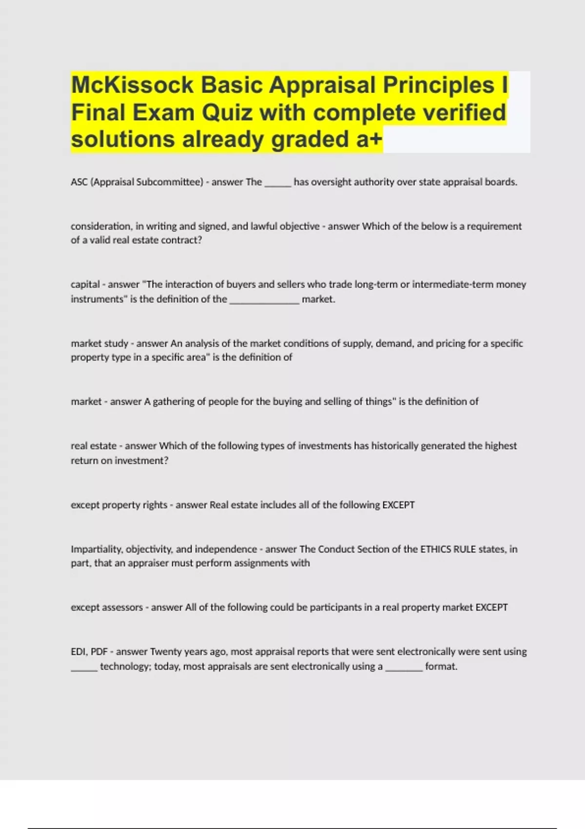 McKissock Basic Appraisal Principles I Final Exam Quiz with complete verified solutions already graded A+
