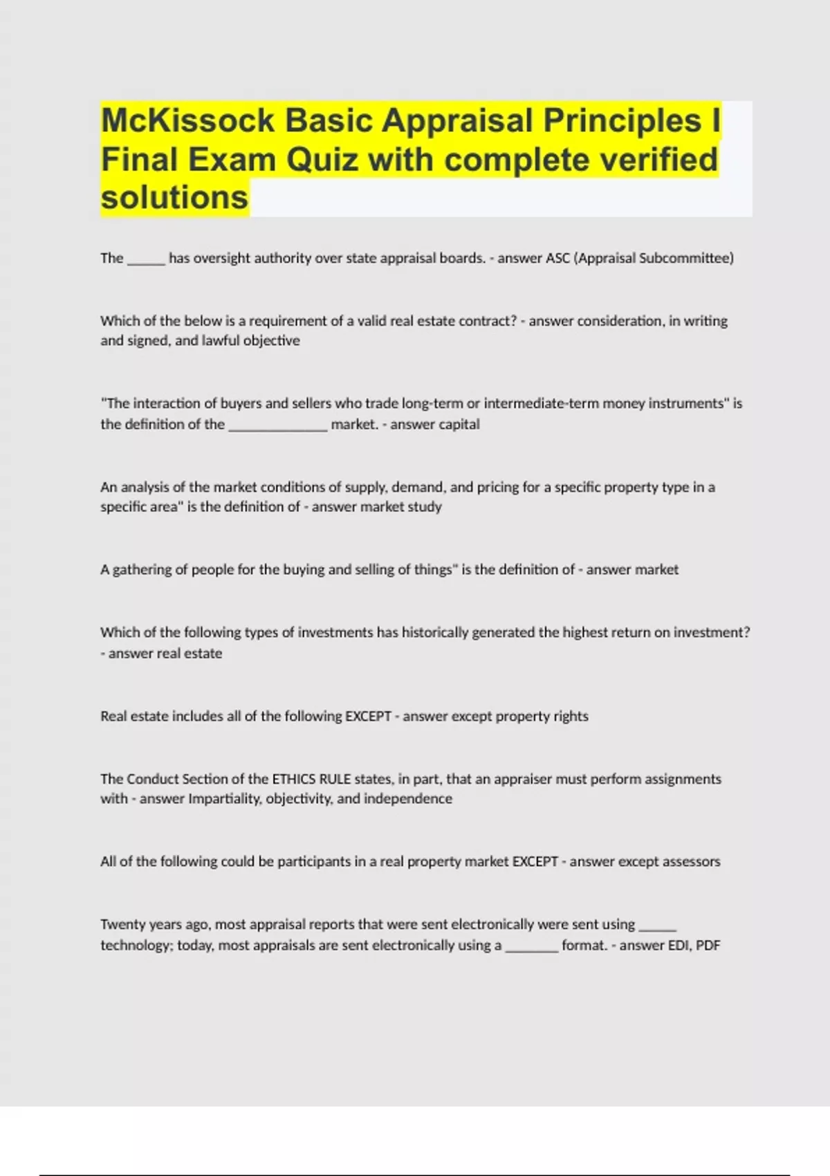 McKissock Basic Appraisal Principles I Final Exam Quiz with complete verified solutions
