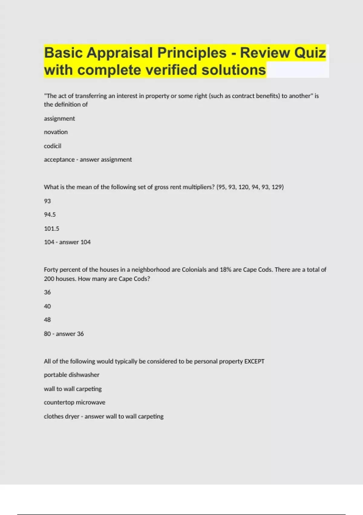 Basic Appraisal Principles - Review Quiz with complete verified solutions.