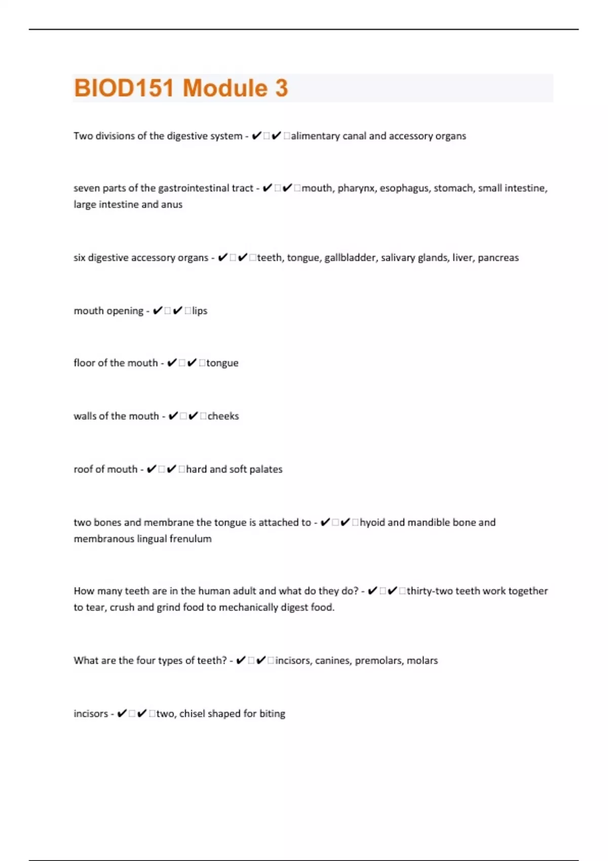 Two divisions of the digestive system - ️️alimentary canal and accessory organs seven parts of the gastrointestinal tract - ️️mouth, pharynx, esophagus, stomach, small intestine, large intestine and anus six digestive accessory organs - ️️teeth, tongue, gallbladder, salivary glands, liver, pancreas mouth opening - ️️lips floor of the mouth - ️️tongue walls of the mouth - ️️cheeks roof of mouth - ️️hard and soft palates two bones and membrane the tongue is attached to - ️️hyoid and mandible bone and membranous lingual frenulum How many teeth are in the human adult and what do they do? - ️️thirty-two teeth work together to tear, crush and grind food to mechanically digest food. What are the four types of teeth? - ️️incisors, canines, premolars, molars incisors - ️️two, chisel shaped for biting