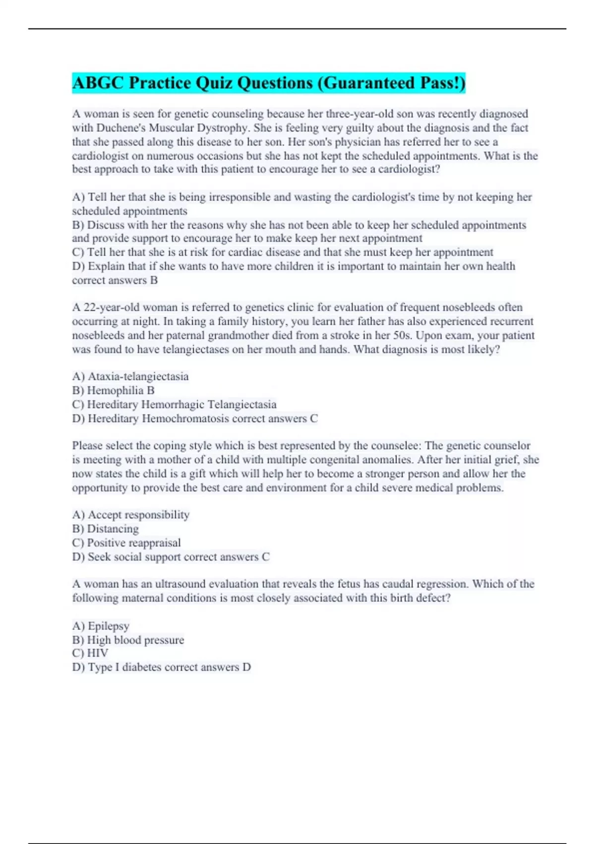 A woman is seen for genetic counseling because her three-year-old son was recently diagnosed with Duchene's Muscular Dystrophy. She is feeling very guilty about the diagnosis and the fact that she passed along this disease to her son. Her son's physician has referred her to see a cardiologist on numerous occasions but she has not kept the scheduled appointments. What is the best approach to take with this patient to encourage her to see a cardiologist? A) Tell her that she is being irresponsible and wasting the cardiologist's time by not keeping her scheduled appointments B) Discuss with her the reasons why she has not been able to keep her scheduled appointments and provide support to encourage her to make keep her next appointment C) Tell her that she is at risk for cardiac disease and that she must keep her appointment D) Explain that if she wants to have more children it is important to maintain her own health correct answers B A 22-year-old woman is referred to genetics clinic for evaluation of frequent nosebleeds often occurring at night. In taking a family history, you learn her father has also experienced recurrent nosebleeds and her paternal grandmother died from a stroke in her 50s. Upon exam, your patient was found to have telangiectases on her mouth and hands. What diagnosis is most likely? A) Ataxia-telangiectasia B) Hemophilia B C) Hereditary Hemorrhagic Telangiectasia D) Hereditary Hemochromatosis correct answers C Please select the coping style which is best represented by the counselee: The genetic counselor is meeting with a mother of a child with multiple congenital anomalies. After her initial grief, she now states the child is a gift which will help her to become a stronger person and allow her the opportunity to provide the best care and environment for a child severe medical problems. A) Accept responsibility B) Distancing C) Positive reappraisal D) Seek social support correct answers C A woman has an ultrasound evaluation that reveals the fetus has caudal regression. Which of the following maternal conditions is most closely associated with this birth defect? A) Epilepsy B) High blood pressure C) HIV D) Type I diabetes correct answers D