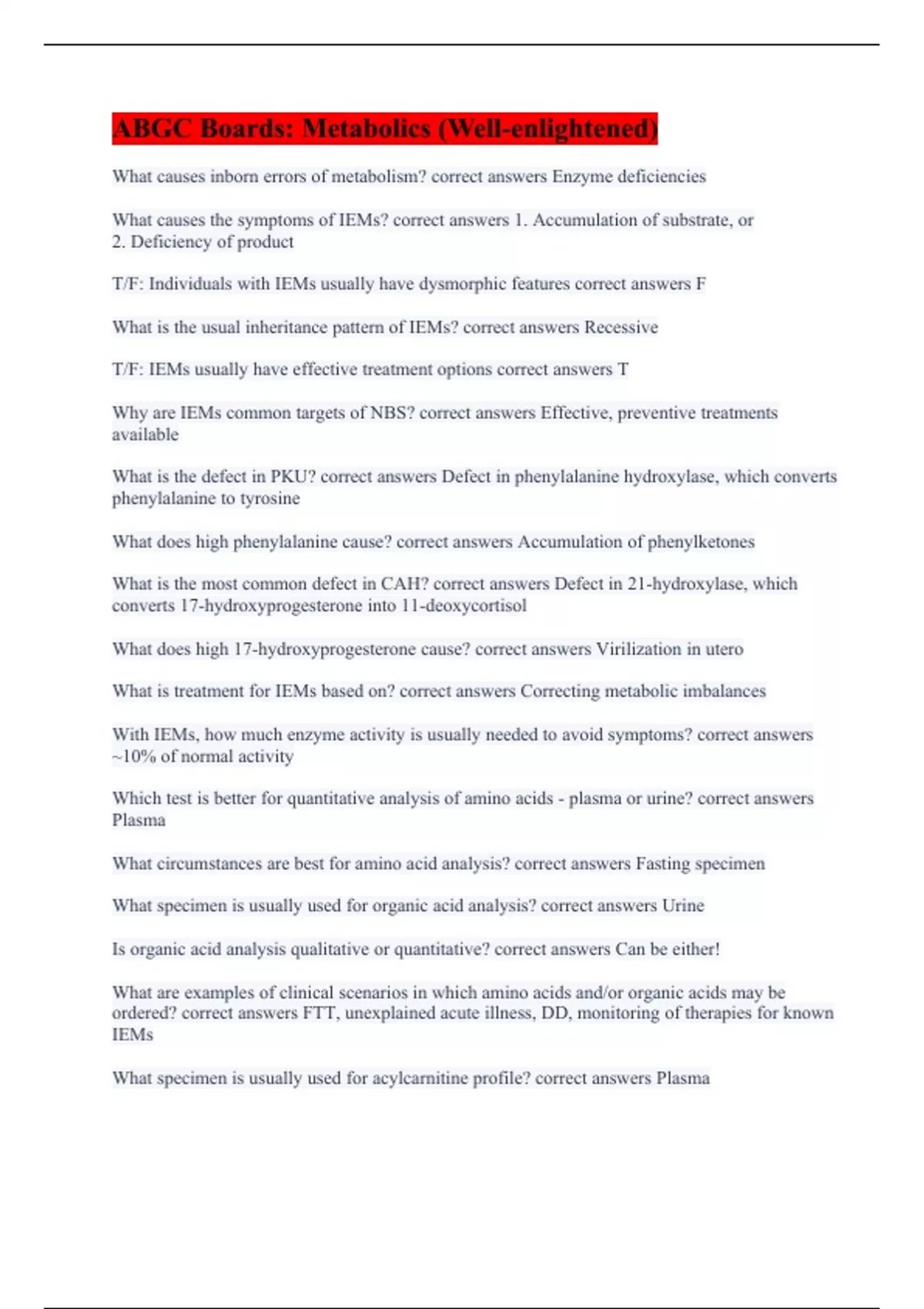 What causes inborn errors of metabolism? correct answers Enzyme deficiencies What causes the symptoms of IEMs? correct answers 1. Accumulation of substrate, or 2. Deficiency of product T/F: Individuals with IEMs usually have dysmorphic features correct answers F What is the usual inheritance pattern of IEMs? correct answers Recessive T/F: IEMs usually have effective treatment options correct answers T Why are IEMs common targets of NBS? correct answers Effective, preventive treatments available What is the defect in PKU? correct answers Defect in phenylalanine hydroxylase, which converts phenylalanine to tyrosine What does high phenylalanine cause? correct answers Accumulation of phenylketones What is the most common defect in CAH? correct answers Defect in 21-hydroxylase, which converts 17-hydroxyprogesterone into 11-deoxycortisol What does high 17-hydroxyprogesterone cause? correct answers Virilization in utero What is treatment for IEMs based on? correct answers Correcting metabolic imbalances With IEMs, how much enzyme activity is usually needed to avoid symptoms? correct answers ~10% of normal activity Which test is better for quantitative analysis of amino acids - plasma or urine? correct answers Plasma What circumstances are best for amino acid analysis? correct answers Fasting specimen What specimen is usually used for organic acid analysis? correct answers Urine Is organic acid analysis qualitative or quantitative? correct answers Can be either! What are examples of clinical scenarios in which amino acids and/or organic acids may be ordered? correct answers FTT, unexplained acute illness, DD, monitoring of therapies for known IEMs What specimen is usually used for acylcarnitine profile? correct answers Plasma