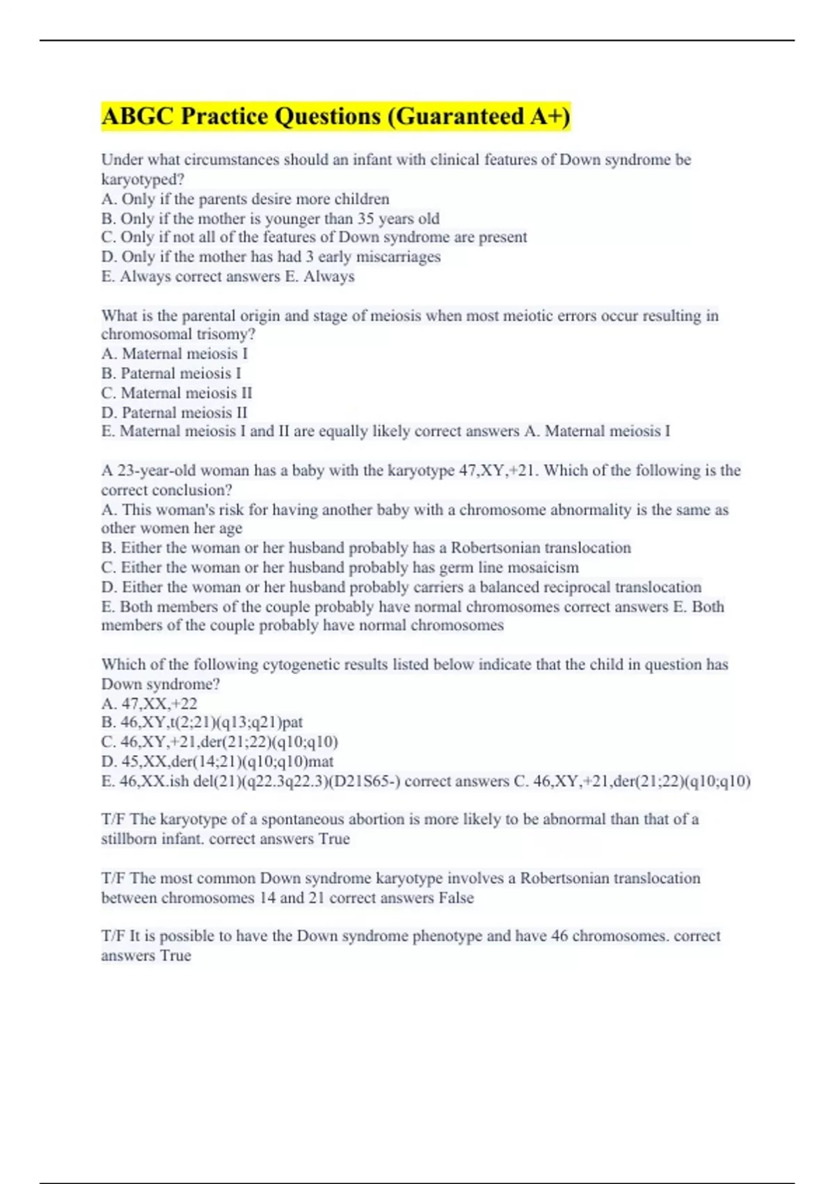 Under what circumstances should an infant with clinical features of Down syndrome be karyotyped? A. Only if the parents desire more children B. Only if the mother is younger than 35 years old C. Only if not all of the features of Down syndrome are present D. Only if the mother has had 3 early miscarriages E. Always correct answers E. Always What is the parental origin and stage of meiosis when most meiotic errors occur resulting in chromosomal trisomy? A. Maternal meiosis I B. Paternal meiosis I C. Maternal meiosis II D. Paternal meiosis II E. Maternal meiosis I and II are equally likely correct answers A. Maternal meiosis I A 23-year-old woman has a baby with the karyotype 47,XY,+21. Which of the following is the correct conclusion? A. This woman's risk for having another baby with a chromosome abnormality is the same as other women her age B. Either the woman or her husband probably has a Robertsonian translocation C. Either the woman or her husband probably has germ line mosaicism D. Either the woman or her husband probably carriers a balanced reciprocal translocation E. Both members of the couple probably have normal chromosomes correct answers E. Both members of the couple probably have normal chromosomes Which of the following cytogenetic results listed below indicate that the child in question has Down syndrome? A. 47,XX,+22 B. 46,XY,t(2;21)(q13;q21)pat C. 46,XY,+21,der(21;22)(q10;q10) D. 45,XX,der(14;21)(q10;q10)mat E. 46,XX.ish del(21)(q22.3q22.3)(D21S65-) correct answers C. 46,XY,+21,der(21;22)(q10;q10) T/F The karyotype of a spontaneous abortion is more likely to be abnormal than that of a stillborn infant. correct answers True T/F The most common Down syndrome karyotype involves a Robertsonian translocation between chromosomes 14 and 21 correct answers False T/F It is possible to have the Down syndrome phenotype and have 46 chromosomes. correct answers True