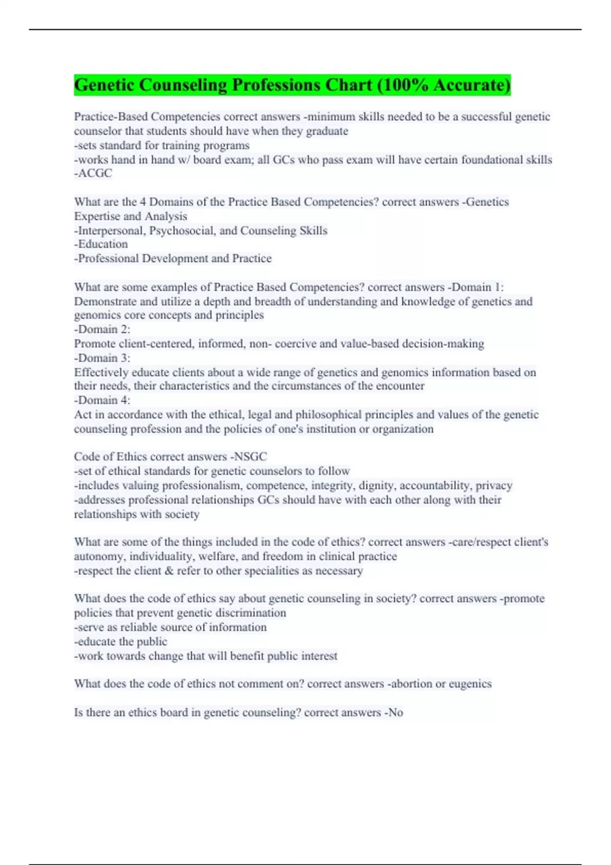 Practice-Based Competencies correct answers -minimum skills needed to be a successful genetic counselor that students should have when they graduate -sets standard for training programs -works hand in hand w/ board exam; all GCs who pass exam will have certain foundational skills -ACGC What are the 4 Domains of the Practice Based Competencies? correct answers -Genetics Expertise and Analysis -Interpersonal, Psychosocial, and Counseling Skills -Education -Professional Development and Practice What are some examples of Practice Based Competencies? correct answers -Domain 1: Demonstrate and utilize a depth and breadth of understanding and knowledge of genetics and genomics core concepts and principles -Domain 2: Promote client-centered, informed, non- coercive and value-based decision-making -Domain 3: Effectively educate clients about a wide range of genetics and genomics information based on their needs, their characteristics and the circumstances of the encounter -Domain 4: Act in accordance with the ethical, legal and philosophical principles and values of the genetic counseling profession and the policies of one's institution or organization Code of Ethics correct answers -NSGC -set of ethical standards for genetic counselors to follow -includes valuing professionalism, competence, integrity, dignity, accountability, privacy -addresses professional relationships GCs should have with each other along with their relationships with society What are some of the things included in the code of ethics? correct answers -care/respect client's autonomy, individuality, welfare, and freedom in clinical practice -respect the client & refer to other specialities as necessary What does the code of ethics say about genetic counseling in society? correct answers -promote policies that prevent genetic discrimination -serve as reliable source of information -educate the public -work towards change that will benefit public interest What does the code of ethics not comment on? correct answers -abortion or eugenics Is there an ethics board in genetic counseling? correct answers -No