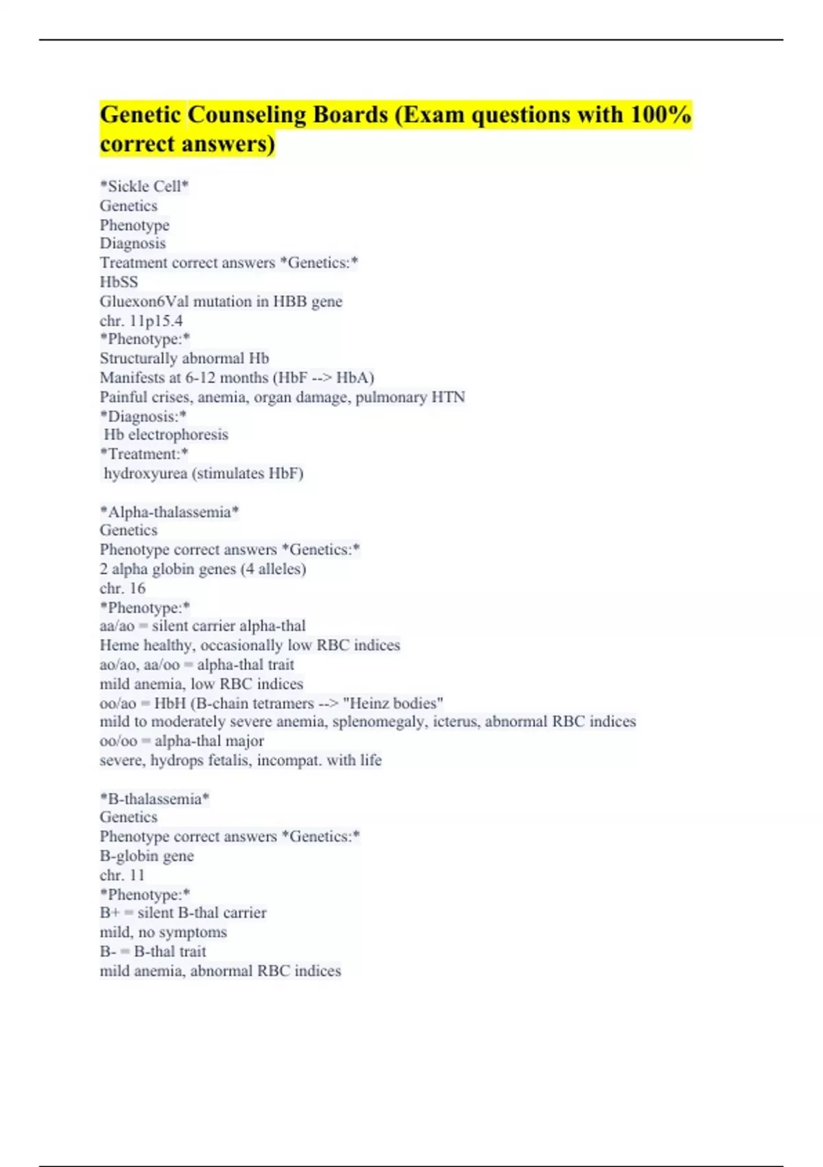 *Sickle Cell* Genetics Phenotype Diagnosis Treatment correct answers *Genetics:* HbSS Gluexon6Val mutation in HBB gene chr. 11p15.4 *Phenotype:* Structurally abnormal Hb Manifests at 6-12 months (HbF --> HbA) Painful crises, anemia, organ damage, pulmonary HTN *Diagnosis:* Hb electrophoresis *Treatment:* hydroxyurea (stimulates HbF) *Alpha-thalassemia* Genetics Phenotype correct answers *Genetics:* 2 alpha globin genes (4 alleles) chr. 16 *Phenotype:* aa/ao = silent carrier alpha-thal Heme healthy, occasionally low RBC indices ao/ao, aa/oo = alpha-thal trait mild anemia, low RBC indices oo/ao = HbH (B-chain tetramers --> "Heinz bodies" mild to moderately severe anemia, splenomegaly, icterus, abnormal RBC indices oo/oo = alpha-thal major severe, hydrops fetalis, incompat. with life *B-thalassemia* Genetics Phenotype correct answers *Genetics:* B-globin gene chr. 11 *Phenotype:* B+ = silent B-thal carrier mild, no symptoms B- = B-thal trait mild anemia, abnormal RBC indices