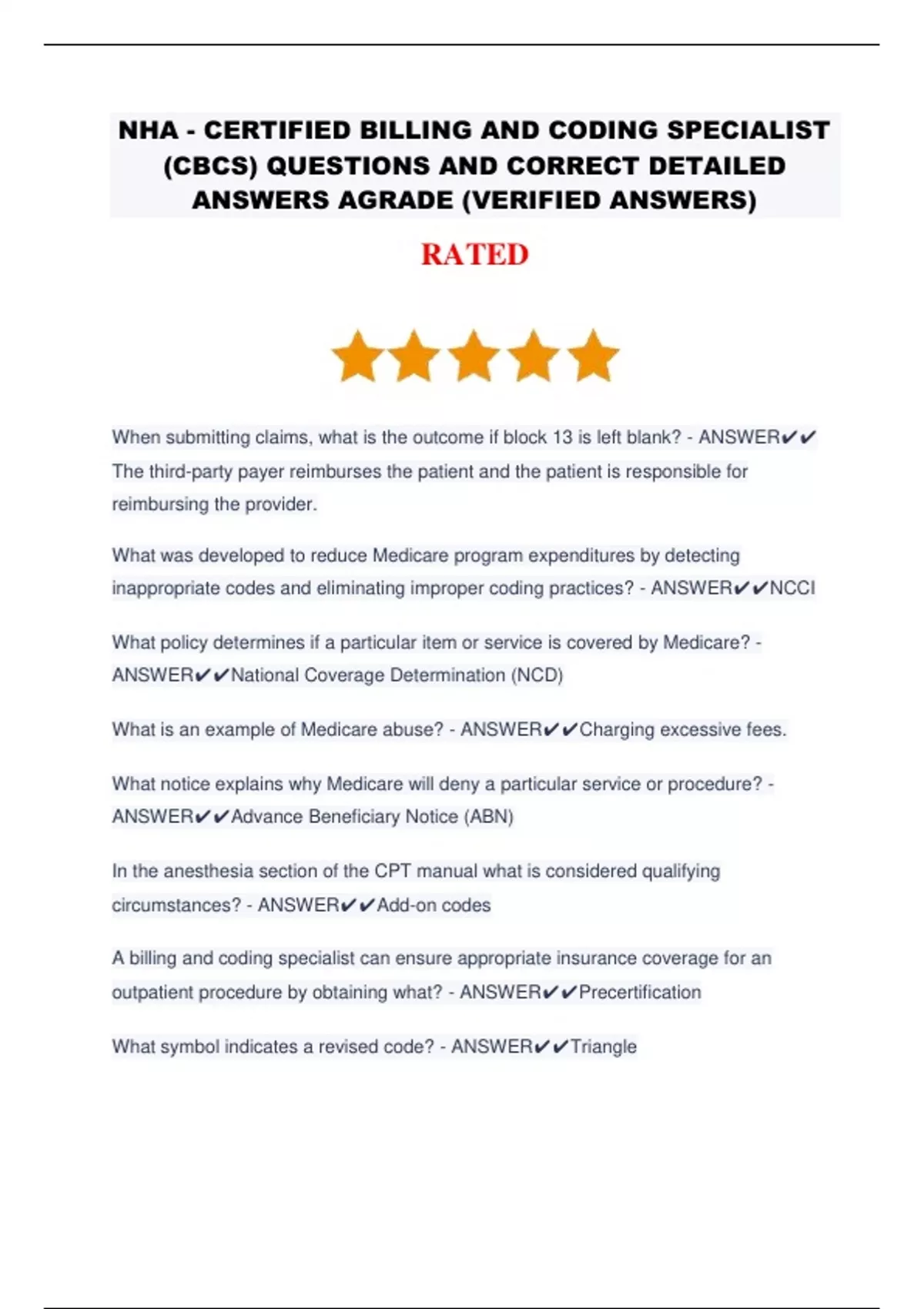 NHA - CERTIFIED BILLING AND CODING SPECIALIST (CBCS) QUESTIONS AND CORRECT DETAILED ANSWERS AGRADE (VERIFIED ANSWERS)