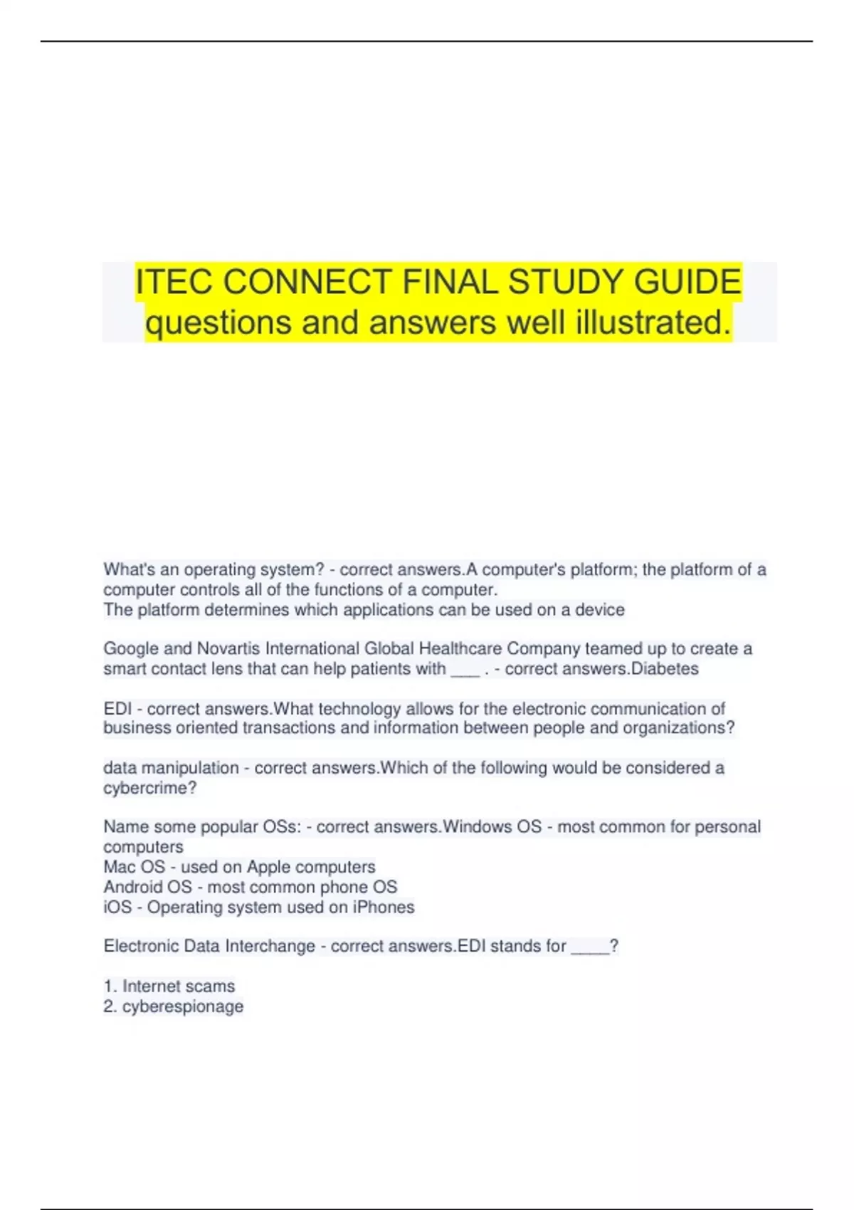 ITEC CONNECT FINAL STUDY GUIDE questions and answers well illustrated. What's an operating system? - correct answers.A computer's platform; the platform of a computer controls all of the functions of a computer. The platform determines which applications can be used on a device Google and Novartis International Global Healthcare Company teamed up to create a smart contact lens that can help patients with ___ . - correct answers.Diabetes EDI - correct answers.What technology allows for the electronic communication of business oriented transactions and information between people and organizations? data manipulation - correct answers.Which of the following would be considered a cybercrime? Name some popular OSs: - correct answers.Windows OS - most common for personal computers Mac OS - used on Apple computers Android OS - most common phone OS iOS - Operating system used on iPhones Electronic Data Interchange - correct answers.EDI stands for ____? 1. Internet scams 2. cyberespionage 3. information theft - correct answers.Which of the following are considered cybercrimes? Won't this be amazing? It's a contact lens that monitors sugar levels in tears to help patients with _____. - correct answers.Diabetes Describe Windows OS: - correct answers.Windows operating systems are used in a variety of Microsoft's digital devices including desktops, laptops, phones, and tablet computers. Windows 10 is the latest version of Windows. Windows is owned by Microsoft Verizon, ATT, T-mobile, Sprint - correct answers.The major U.S. cell phone providers. cybercrime - correct answers.A crime in which a computer is the object of the crime or is used to commit a crime or offense is called _____. AviCenna is smart software is being developed by IBM that will be used to assist radiologists with interpreting medical images such as ___ . - correct answers.CT Scans What are the strengths and weaknesses of Windows OS? - correct answers.-Strengths: Windows personal computers are by far the most popular computers in the world and are used by most businesses and government agencies; they have the most available software and often the best prices since there's more. -Weaknesses: they are not as intuitive or as easy to use as Macintosh computers and that they are more prone to viruses and other computer problems than Macintosh computers Verizon - correct answers.Sprint, T-Mobile, ATT & ___ are the major national cell phone providers in the U.S. 1. data manipulation 2. data corruption 3. cyberbullying - correct answers.Which of the following are considered cybercrimes? IBM is developing smart software called AviCenna. AviCenna reviews medical images such as CT scans, potentially decreasing the workload and increasing the diagnoses accuracy of ___ . - correct answers.Radiologists The Da Vinci robot, named after the famous artist and inventor, has a magnified 3D high-definition vision system and tiny wristed instruments that bend and rotate far greater than the human hand that allow ___ to perform intricate procedures. - correct answers.Surgeons