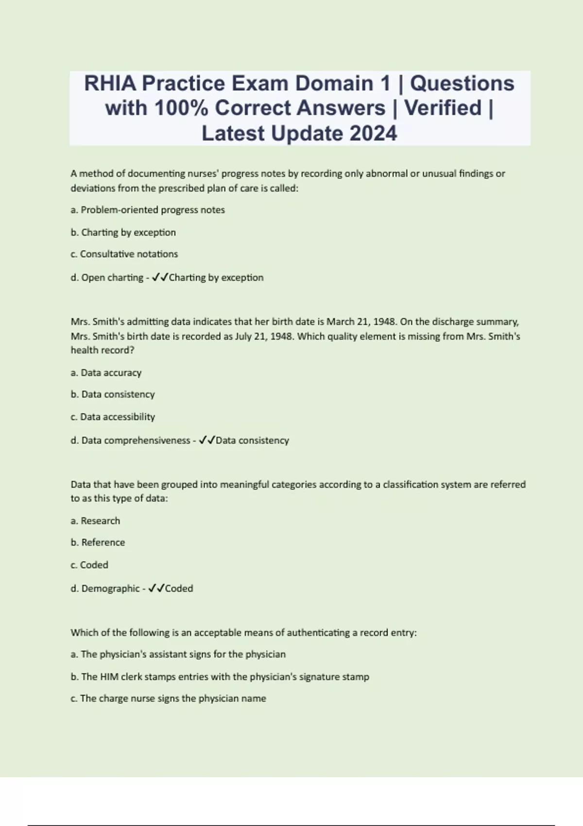 A method of documenting nurses' progress notes by recording only abnormal or unusual findings or deviations from the prescribed plan of care is called: a. Problem-oriented progress notes b. Charting by exception c. Consultative notations d. Open charting - Charting by exception Mrs. Smith's admitting data indicates that her birth date is March 21, 1948. On the discharge summary, Mrs. Smith's birth date is recorded as July 21, 1948. Which quality element is missing from Mrs. Smith's health record? a. Data accuracy b. Data consistency c. Data accessibility d. Data comprehensiveness - Data consistency Data that have been grouped into meaningful categories according to a classification system are referred to as this type of data: a. Research b. Reference c. Coded d. Demographic - Coded