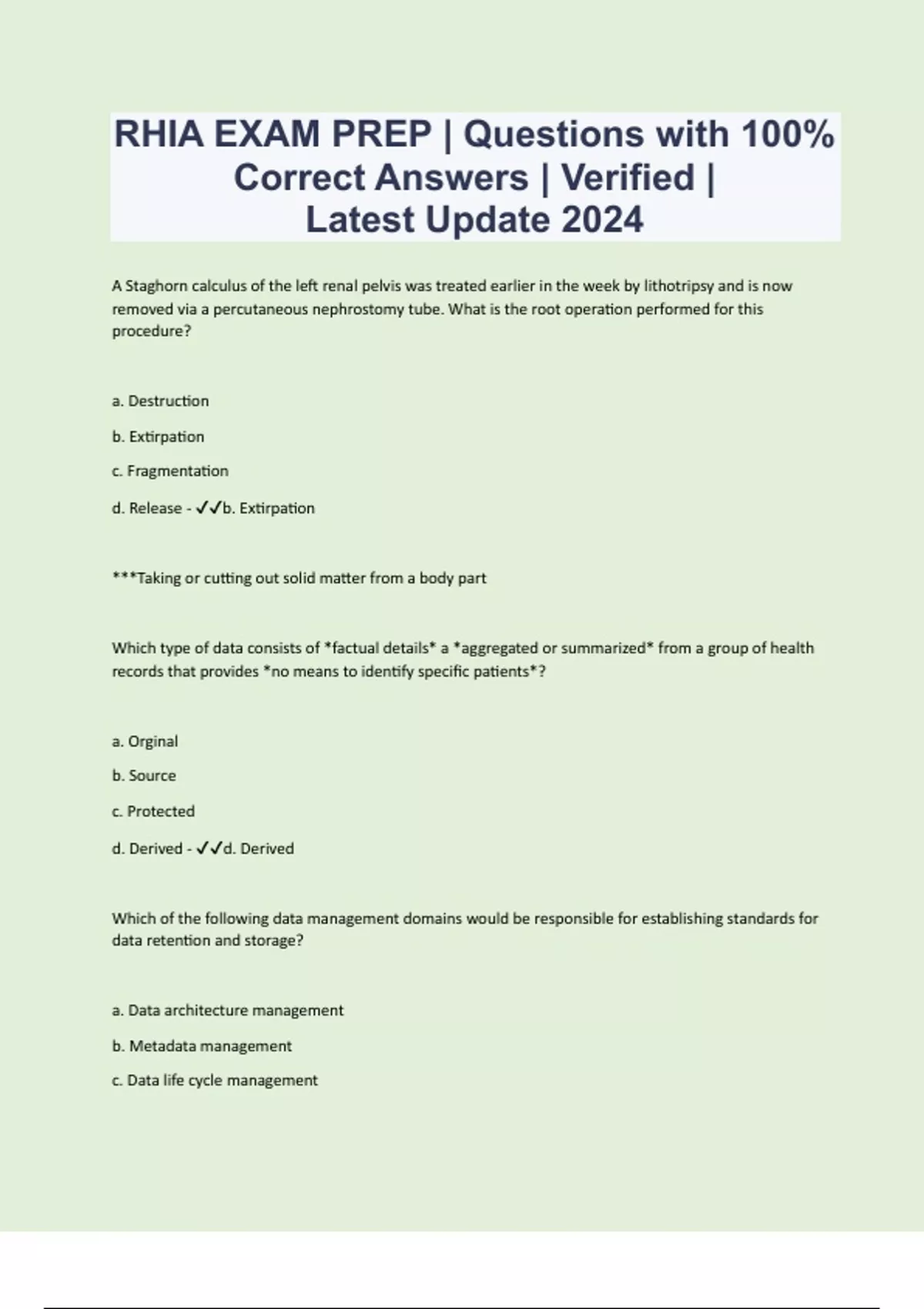 A Staghorn calculus of the left renal pelvis was treated earlier in the week by lithotripsy and is now removed via a percutaneous nephrostomy tube. What is the root operation performed for this procedure? a. Destruction b. Extirpation c. Fragmentation d. Release - b. Extirpation ***Taking or cutting out solid matter from a body part Which type of data consists of *factual details* a *aggregated or summarized* from a group of health records that provides *no means to identify specific patients*? a. Orginal b. Source c. Protected d. Derived - d. Derived Which of the following data management domains would be responsible for establishing standards for data retention and storage? a. Data architecture management b. Metadata management c. Data life cycle management