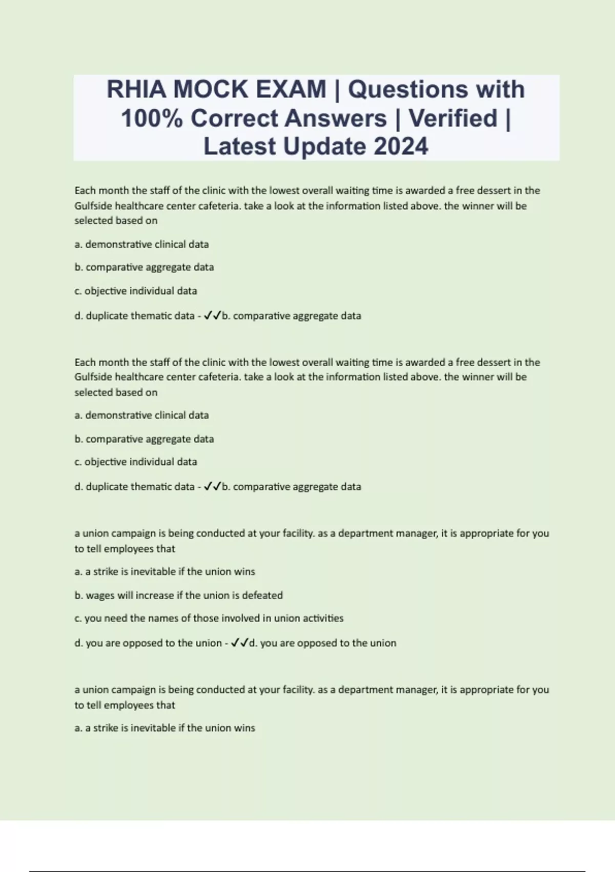 RHIA MOCK EXAM | Questions with 100% Correct Answers | Verified | Latest Update 2024