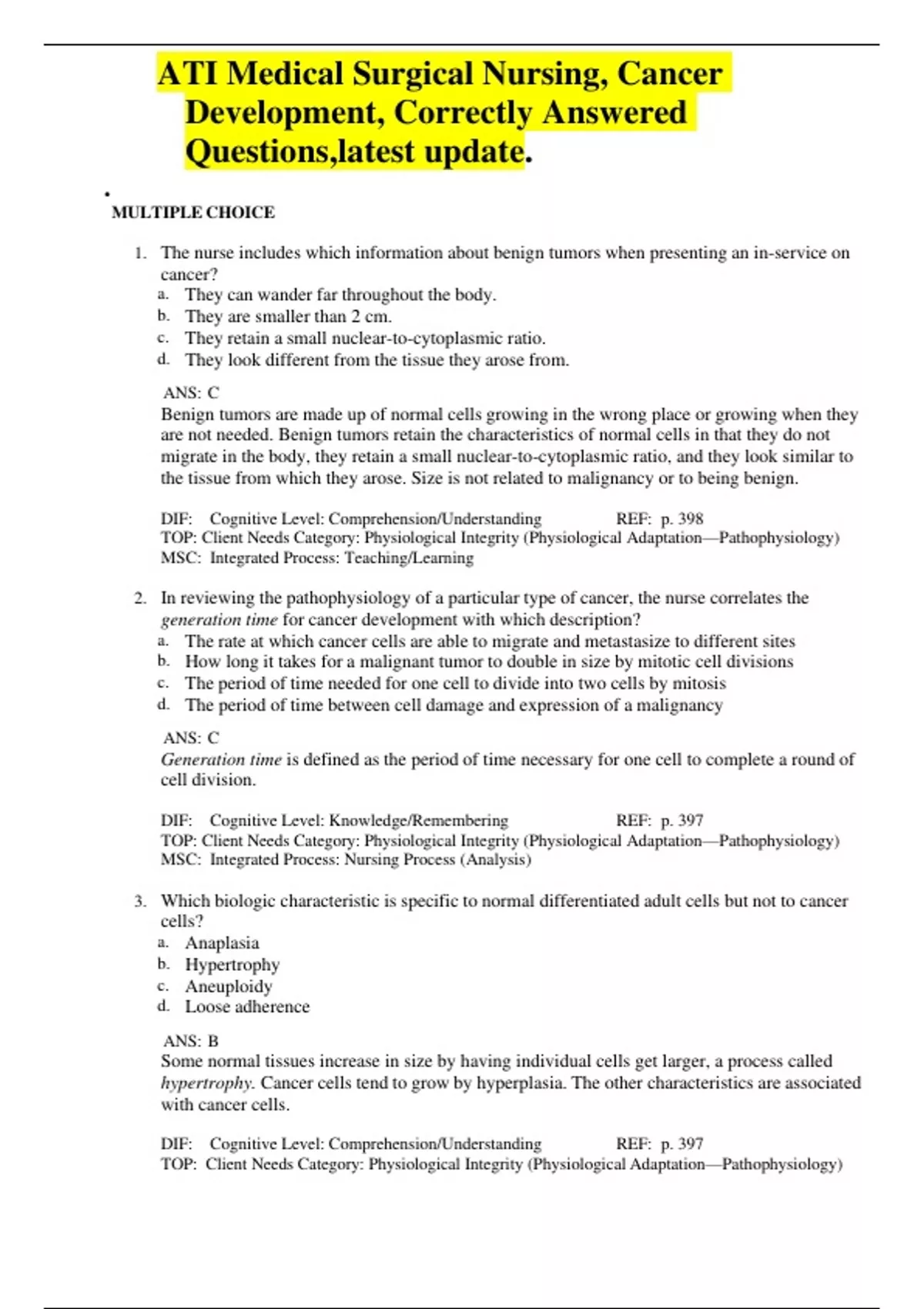 ATI Medical Surgical Nursing, Cancer Development, Correctly Answered Questions,latest update.