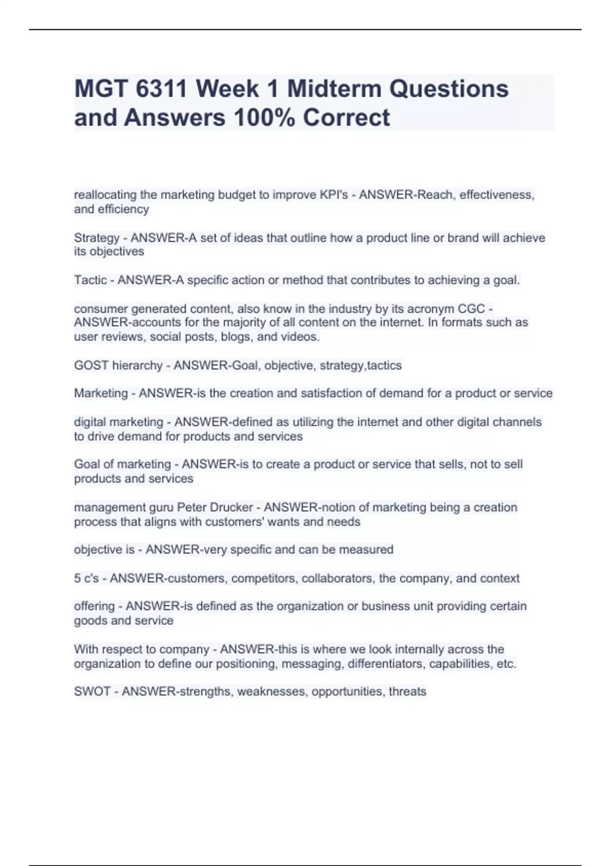MGT 6311 Week 1 Midterm Questions and Answers 100% Correct MGT 6311 Week 1 Midterm Questions and Answers 100% Correct MGT 6311 Week 1 Midterm Questions and Answers 100% Correct MGT 6311 Week 1 Midterm Questions and Answers 100% Correct reallocating the marketing budget to improve KPI's - ANSWER-Reach, effectiveness, and efficiency Strategy - ANSWER-A set of ideas that outline how a product line or brand will achieve its objectives Tactic - ANSWER-A specific action or method that contributes to achieving a goal. consumer generated content, also know in the industry by its acronym CGC - ANSWER-accounts for the majority of all content on the internet. In formats such as user reviews, social posts, blogs, and videos. GOST hierarchy