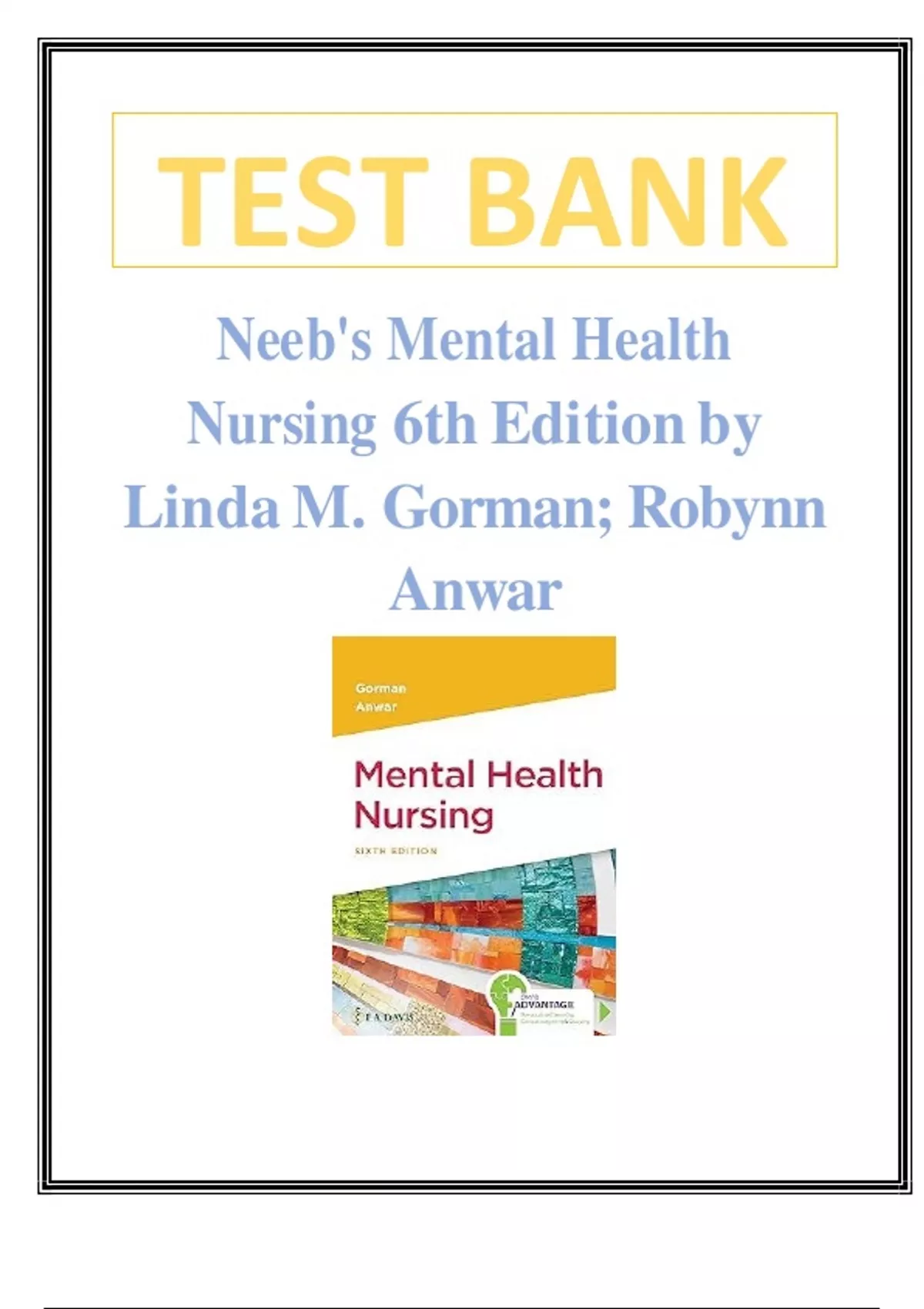 Test Bank for Neeb's Mental Health Nursing 6th Edition By Linda M. Gorman; Robynn Anwar Latest Verified Review 2024 Practice Questions and Answers for Exam Preparation, 100% Correct with Explanations, Highly Recommended, Download to Score A+ Table of Contents Chapter 01: History of Mental Health Nursing Chapter 02: Basics of Communications Chapter 03: Ethics and Law Chapter 04: Developmental Psychology Throughout the Life Span Chapter 05: Sociocultural Influences on Mental Health Chapter 06: Nursing Process in Mental Health Chapter 07: Coping and Defense Mechanisms Chapter 08: Mental Health Treatments Chapter 09: Complementary and Alternative Treatment Modalities Chapter 10: Anxiety, Anxiety-Related, and Somatic Symptom Disorders Chapter 11: Depressive Disorders Chapter 12: Bipolar Disorders Chapter 13: Suicide Chapter 14: Personality Disorders Chapter 15: Schizophrenia Spectrum and Other Psychotic Disorders Chapter 16: Neurocognitive Disorders: Delirium and Dementia Chapter 17: Substance Use and Addictive Disorders Chapter 18: Eating Disorders Chapter 19: Childhood and Adolescent Mental Health Issues Chapter 20: Postpartum Issues in Mental Health Chapter 21: Aging Population Chapter 22: Victims of Abuse and Violence