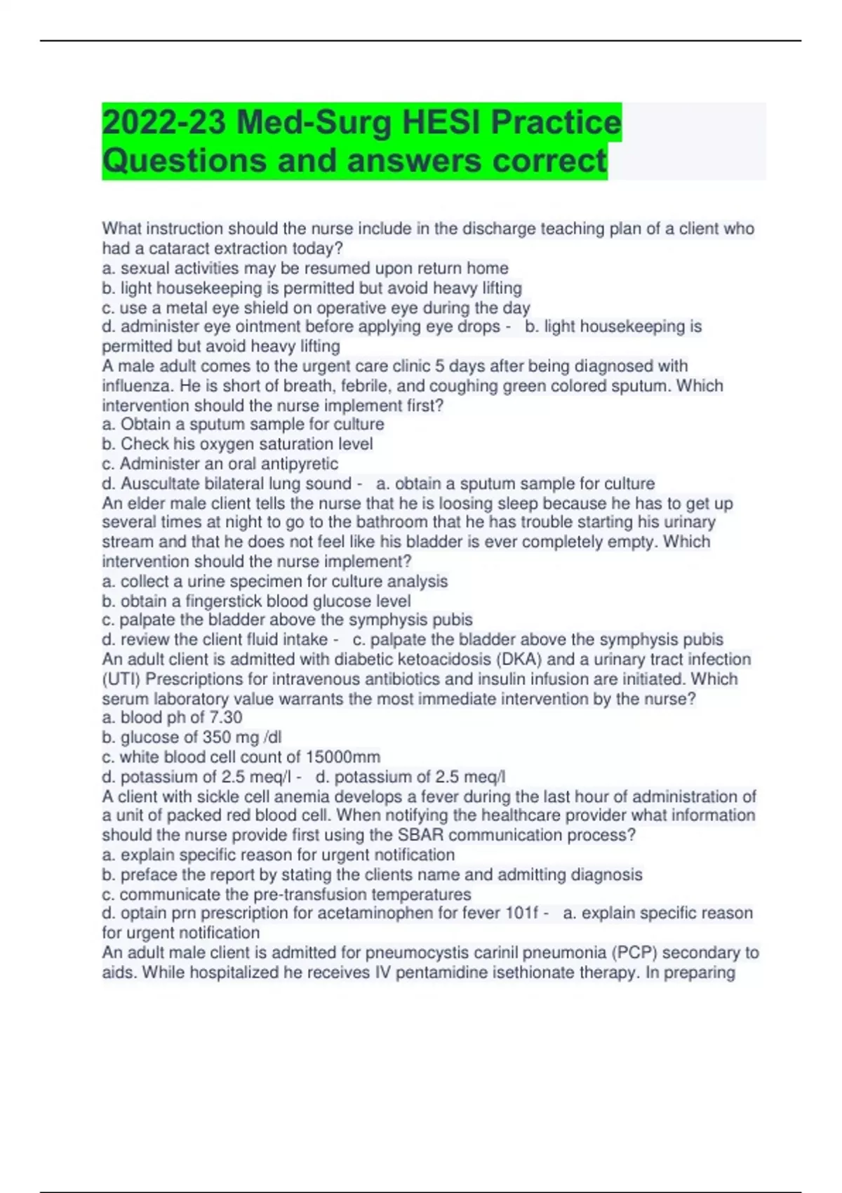 2022-23 Med-Surg HESI Practice Questions and answers correct What instruction should the nurse include in the discharge teaching plan of a client who had a cataract extraction today? a. sexual activities may be resumed upon return home b. light housekeeping is permitted but avoid heavy lifting c. use a metal eye shield on operative eye during the day d. administer eye ointment before applying eye drops - b. light housekeeping is permitted but avoid heavy lifting A male adult comes to the urgent care clinic 5 days after being diagnosed with influenza. He is short of breath, febrile, and coughing green colored sputum. Which intervention should the nurse implement first? a. Obtain a sputum sample for culture b. Check his oxygen saturation level c. Administer an oral antipyretic d. Auscultate bilateral lung sound - a. obtain a sputum sample for culture An elder male client tells the nurse that he is loosing sleep because he has to get up several times at night to go to the bathroom that he has trouble starting his urinary stream and that he does not feel like his bladder is ever completely empty. Which intervention should the nurse implement? a. collect a urine specimen for culture analysis b. obtain a fingerstick blood glucose level c. palpate the bladder above the symphysis pubis d. review the client fluid intake - c. palpate the bladder above the symphysis pubis An adult client is admitted with diabetic ketoacidosis (DKA) and a urinary tract infection (UTI) Prescriptions for intravenous antibiotics and insulin infusion are initiated. Which serum laboratory value warrants the most immediate intervention by the nurse? a. blood ph of 7.30 b. glucose of 350 mg /dl c. white blood cell count of 15000mm d. potassium of 2.5 meq/l - d. potassium of 2.5 meq/l A client with sickle cell anemia develops a fever during the last hour of administration of a unit of packed red blood cell. When notifying the healthcare provider what information should the nurse provide first using the SBAR communication process? a. explain specific reason for urgent notification b. preface the report by stating the clients name and admitting diagnosis c. communicate the pre-transfusion temperatures d. optain prn prescription for acetaminophen for fever 101f - a. explain specific reason for urgent notification An adult male client is admitted for pneumocystis carinil pneumonia (PCP) secondary to aids. Wh