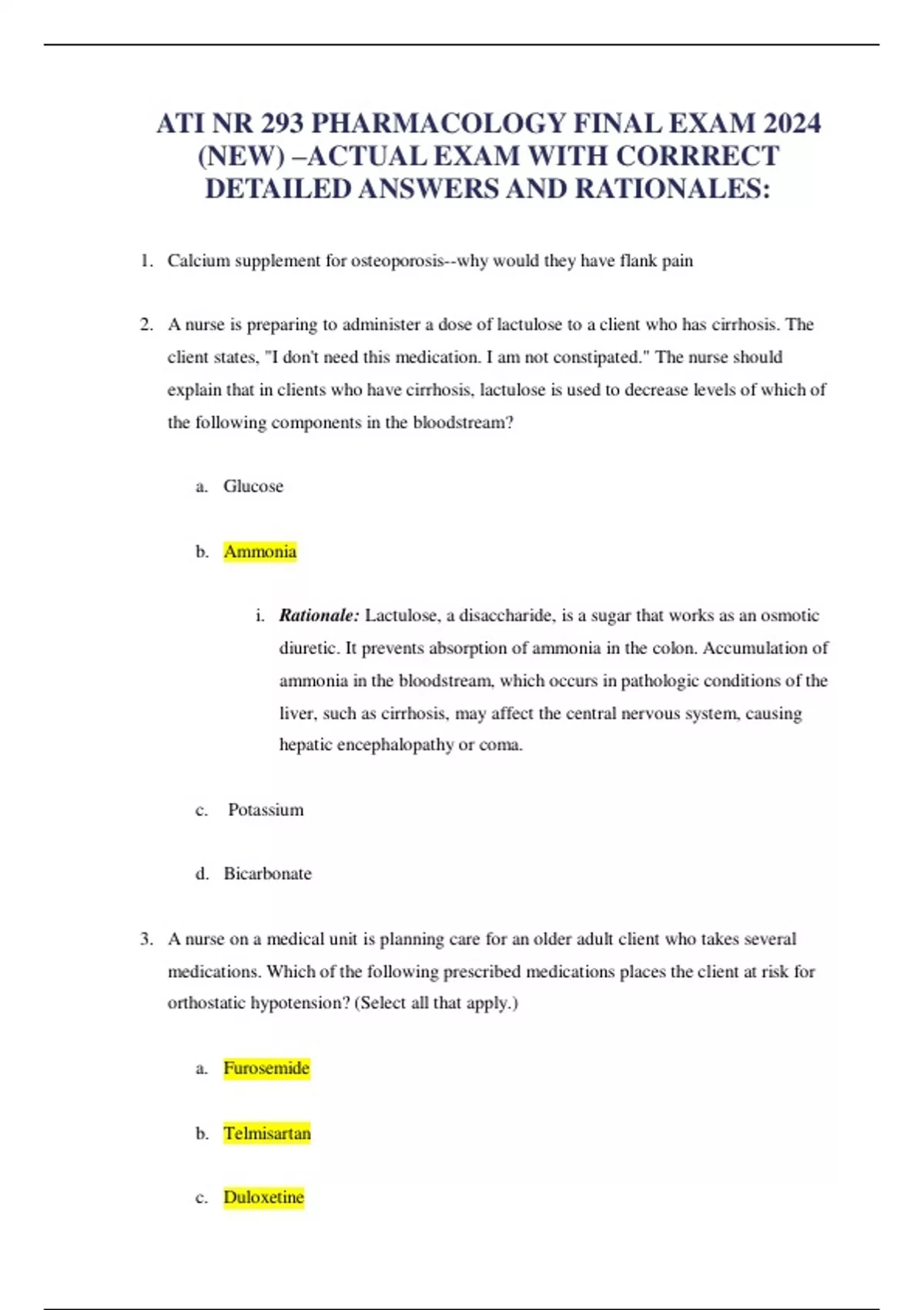 ATI NR 293 PHARMACOLOGY FINAL EXAM 2024 (NEW) –ACTUAL EXAM WITH CORRRECT DETAILED ANSWERS AND RATIONALES: