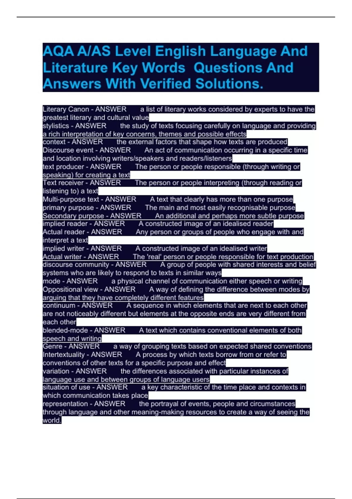 AQA A/AS Level English Language And Literature Key Words Questions And Answers With Verified Solutions.