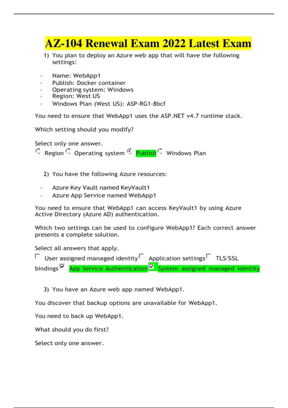 AZ-104 Renewal Exam 2022 Latest Exam 1) You plan to deploy an Azure web app that will have the following settings: • Name: WebApp1 • Publish: Docker container • Operating system: Windows • Region: West US • Windows Plan (West US): ASP-RG1-8bcf You need to ensure that WebApp1 uses the ASP.NET v4.7 runtime stack. Which setting should you modify? Select only one answer. Region Operating system Publish Windows Plan 2) You have the following Azure resources: • Azure Key Vault named KeyVault1 • Azure App Service named WebApp1 You need to ensure that WebApp1 can access KeyVault1 by using Azure Active Directory (Azure AD) authentication. Which two settings can be used to configure WebApp1? Each correct answer presents a complete solution. Select all answers that apply. User assigned managed identity Application settings TLS/SSL bindings App Service Authentication System assigned managed identity 3) You have an Azure web app named WebApp1. You discover that backup options are unavailable for WebApp1. You need to back up WebApp1. What should you do first? Select only one answer. Modify the platform settings of WebApp1. Modify the Application settings of WebApp1. Scale up the app service plan. Scale out the app service plan. 4) You have an Azure web app named Contoso2023. You add a deployment slot to Contoso2023 named Slot1. You need to be able to perform a deployment slot swap with preview. What should you modify? Select only one answer. application settings for Contoso2023 general settings for Contoso2023 application settings for Contoso2023-Slot1 general settings for Contoso2023-Slot1 5) You plan to create an Azure container instance named container1 that will use a Docker image named Image
