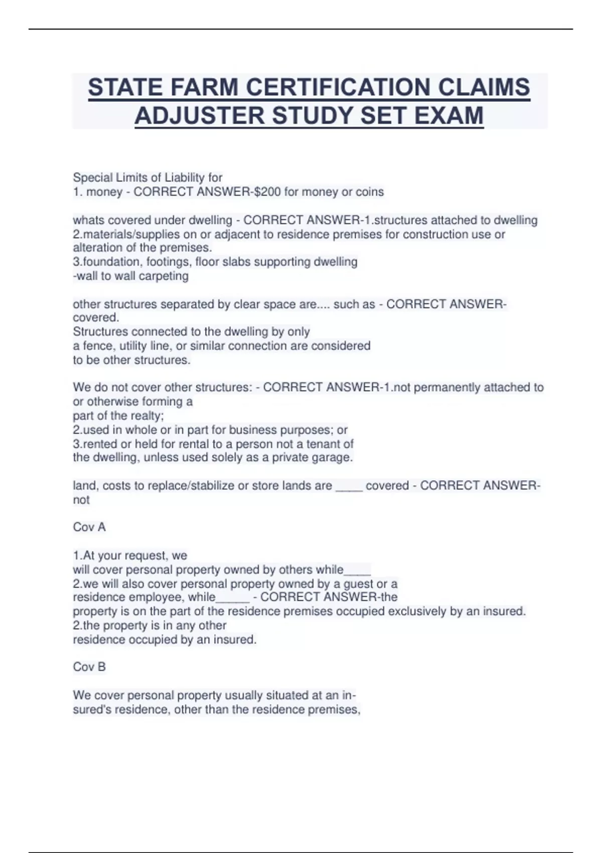 STATE FARM CERTIFICATION CLAIMS ADJUSTER STUDY SET EXAM Special Limits of Liability for 1. money - CORRECT ANSWER-$200 for money or coins whats covered under dwelling - CORRECT ANSWER-tures attached to dwelling ials/supplies on or adjacent to residence premises for construction use or alteration of the premises. ation, footings, floor slabs supporting dwelling -wall to wall carpeting other structures separated by clear space are.... such as - CORRECT ANSWERcovered. Structures connected to the dwelling by only a fence, utility line, or similar connection are considered to be other structures. We do not cover other structures: - CORRECT ANSWER- permanently attached to or otherwise forming a part of the realty; in whole or in part for business purposes; or d or held for rental to a person not a tenant of the dwelling, unless used solely as a private garage. land, costs to replace/stabilize or store lands are ____ covered - CORRECT ANSWERnot Cov A 1.At your request, we will cover personal property owned by others while____ will also cover personal property owned by a guest or a residence employee, while_____ - CORRECT ANSWER-the property is on the part of the residence premises occupied exclusively by an insured. property is in any other residence occupied by an insured. Cov B We cover personal property usually situated at an insured's residence, other than the residence premises,