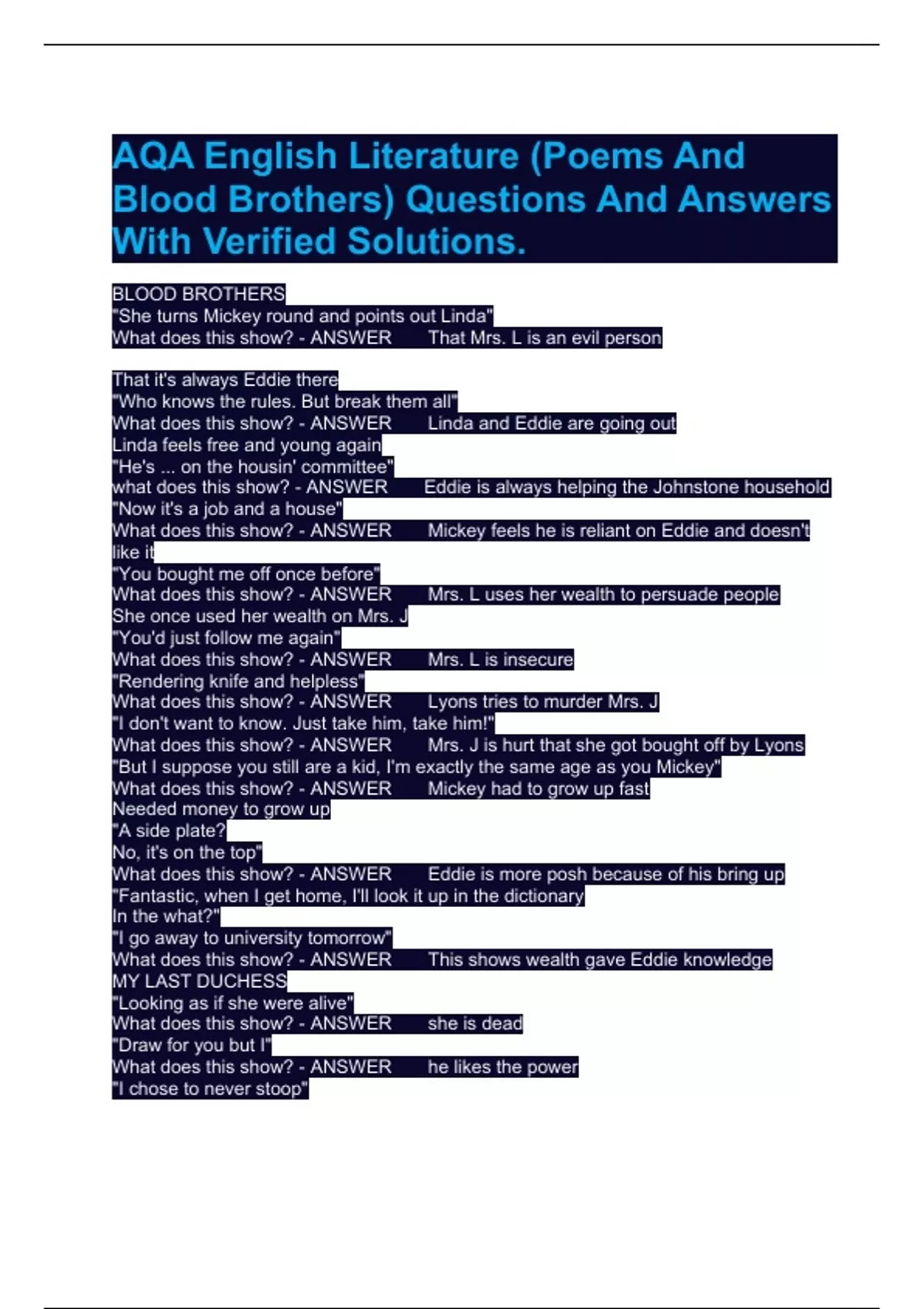 AQA English Literature (Poems And Blood Brothers) Questions And Answers With Verified Solutions.