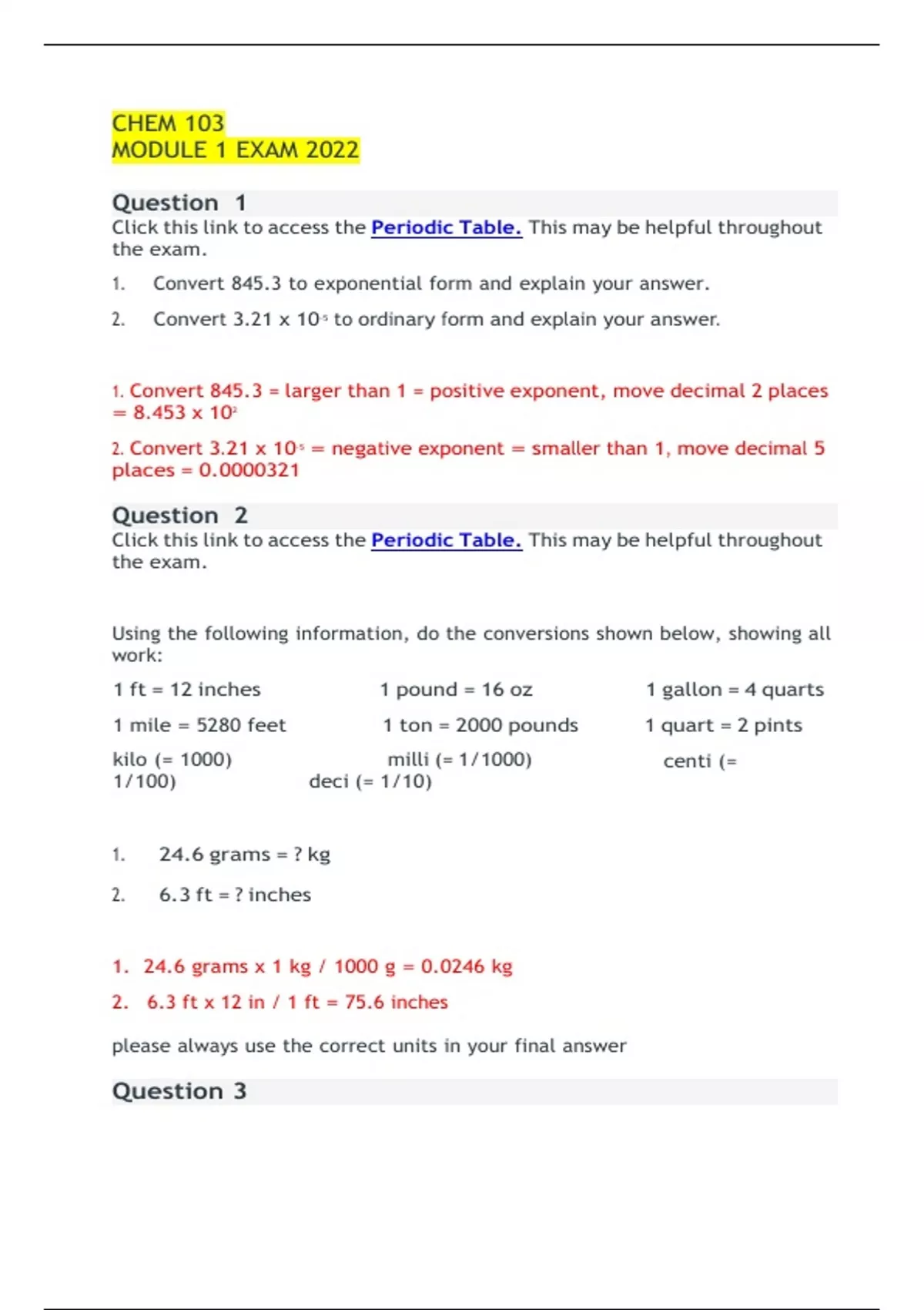 CHEM 103 MODULE 1 EXAM 2022 Question 1 Click this link to access the Periodic Table. This may be helpful throughout the exam. 1. Convert 845.3 to exponential form and explain your answer. 2. Convert 3.21 x 10 -5 to ordinary form and explain your answer. 1. Convert 845.3 = larger than 1 = positive exponent, move decimal 2 places = 8.453 x 10 2 2. Convert 3.21 x 10 -5 = negative exponent = smaller than 1, move decimal 5 places = 0.0000321 Question 2 Click this link to access the Periodic Table. This may be helpful throughout the exam. Using the following information, do the conversions shown below, showing all work: 1 ft = 12 inches 1 pound = 16 oz 1 gallon = 4 quarts 1 mile = 5280 feet 1 ton = 2000 pounds 1 quart = 2 pints kilo (= 1000) 1/100) milli (= 1/1000) deci (= 1/10) centi (= 1. 24.6 grams = ? kg 2. 6.3 ft = ? inches 1. 24.6 grams x 1 kg / 1000 g = 0.0246 kg 2. 6.3 ft x 12 in / 1 ft = 75.6 inches please always use the correct units in your final answer Question 3 Click this link to access the Periodic Table. This may be helpful throughout the exam. Do the conversions shown below, showing all work: 1. 28 oC = ? oK 2. 158 oF = ? oC 3. 343 oK = ? oF 1. 28 oC + 273 = 301 oK oC → oK (make larger) +273 2. 158 oF - 32 ÷ 1.8 = 70 oC oF → oC (make smaller) -32 ÷1.8 3. 343 oK - 273 = 70 oC x 1.8 + 32 = 158 oF oK → oC → oF Question 4 Click this link to access the Periodic Table. This may be helpful throughout the exam. Be sure to show the correct number of significant figures in each calculation. 1. Show the calculation of the mass of a 18.6 ml sample of freon with density of 1.49 g/ml 2. Show the calculation of the density of crude oil if 26.3 g occupies 30.5 ml. 1. M = D x V = 1.49 x 18.6 = 27.7 g 2. D = M / V = 26.3 / 30.5 = 0.862 g/ml Question 5 Click this link to access the Periodic Table. This may be helpful throughout the exam. 1. 3.0600 contains ? significant figures. 2. 0.0151 contains ? significant figures. 3. 3.0600 ÷ 0.0151 = ? (give answer to correct number of significant figures) 1. 3.0600 contains 5 significant figures. 2. 0.0151 contains 3 significant figures. 3. 3.0600 ÷ 0.0151 = 202.649 = 203 (to 3 significant figures for 0.0151) Question 6 Click this link to access the Periodic Table. This may be helpful throughout the exam. Classify each of the following as an element, compound, solution or heterogeneous mixture and explain your answer. 1. Coca cola 2. Calcium 3. Chili 1. Coca cola - is not on periodic table (not element) - no element names (not compound) appears to be one substance = Solution 2. Calcium - is on periodic table = Element 3. Chili - is not on periodic table (not element) - no element names (not compound) appears as more than one substance (meat, beans, sauce) = Hetero Mix Question 7 Click this link to access the Periodic Table. This may be helpful throughout the exam. Classify each of the following as a chemical change or a physical change 1. Charcoal burns 2. Mixing cake batter with water 31 3. Baking the batter to a cake 1. Charcoal burns - burning always = chemical change 2. Mixing cake batter with water - mixing = physical change 3. Baking the batter to a cake - baking converts batter to new material = chemical change Click this link to access the Periodic Table. This may be helpful throughout the exam. Show the full Nuclear symbol including any + or - charge (n), the atomic number (y), the mass number (x) and the correct element symbol (Z) for each element for which the protons, neutrons and electrons are shown - symbol should appear as follows: xZy +/- n 31 protons, 39 neutrons, 28 electrons 31 protons = Ga31, 39 neutrons = 70Ga31, 28 electrons = (+31 - 28 = +3) = 70Ga +3 Question 9 Click this link to access the Periodic Table. This may be helpful throughout the exam. Name each of the following chemical compounds. Be sure to name all acids as acids (NOT for instance as binary compounds) 1. PF5 2. Al2(CO3)3 3. H2CrO4 1. PF5 - binary molecular = phosphorus pentafluoride 2. Al2(CO3)3 - nonbinary ionic = aluminum carbonate Question 8 2 3 3 3 3. H2CrO4 - nonbinary acid = chromic acid incorrect fluoride prefix Question 10 Click this link to access the Periodic Table. This may be helpful throughout the exam. Write the formula for each of the following chemical compounds explaining the answer with appropriate charges and/or prefixes and/or suffixes. 1. Carbon monoxide 2. Manganese (IV) acetate 3. Phosphorous acid 1. Carbon monoxide - ide = binary, mono = 1 O = CO 2. Manganese (IV) acetate - Mn +4 , C2H3O -1 = Mn(C2H3O2)4 3. Phosphorous acid - nonbinary acid of H + phosphite (PO -3 ) = H PO