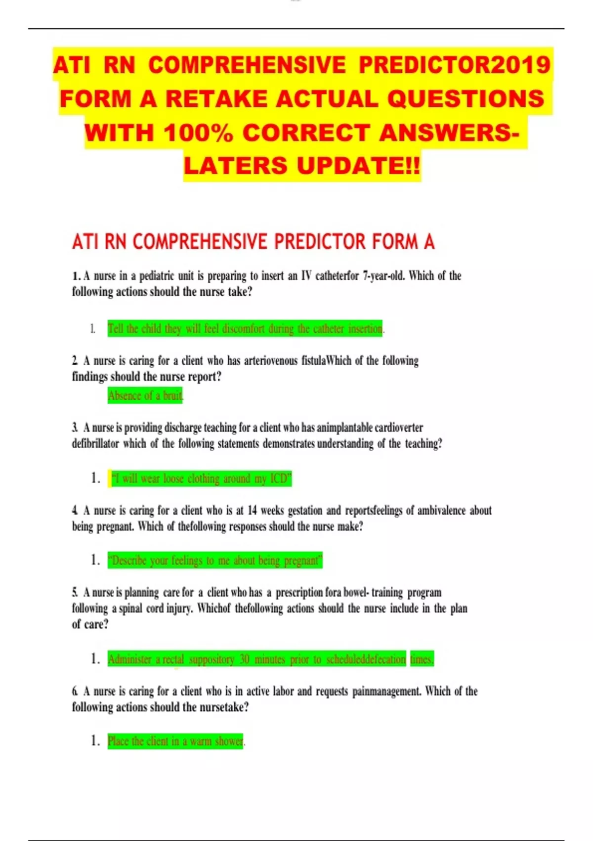 ATI RN COMPREHENSIVE PREDICTOR2019 FORM A RETAKE ACTUAL QUESTIONS WITH 100% CORRECT ANSWERSLATERS UPDATE!! ATI RN COMPREHENSIVE PREDICTOR FORM A 1. A nurse in a pediatric unit is preparing to insert an IV catheterfor 7-year-old. Which of the following actions should the nurse take? 1. Tell the child they will feel discomfort during the catheter insertion. 2. A nurse is caring for a client who has arteriovenous fistulaWhich of the following findings should the nurse report? Absence of a bruit. 3. A nurse is providing discharge teaching for a client who has animplantable cardioverter defibrillator which of the following statements demonstrates understanding of the teaching? 1. “I will wear loose clothing around my ICD” 4. A nurse is caring for a client who is at 14 weeks gestation and reportsfeelings of ambivalence about being pregnant. Which of thefollowing responses should the nurse make? 1. “Describe your feelings to me about being pregnant” 5. A nurse is planning care for a client who has a prescription fora bowel- training program following a spinal cord injury. Whichof thefollowing actions should the nurse include in the plan of care? 1. Administer a rectal suppository 30 minutes prior to scheduleddefecation times. 6. A nurse is caring for a client who is in active labor and requests painmanagement. Which of the following actions should the nursetake? 1. Place the client in a warm shower. lOMoARcPS D| 7. a nurse in an emergency department is performing triage for multiple clients following a disaster in the community. To which ofthe following types of injuries should the nurse assign the highest priority? 1. Below-the knee amputation