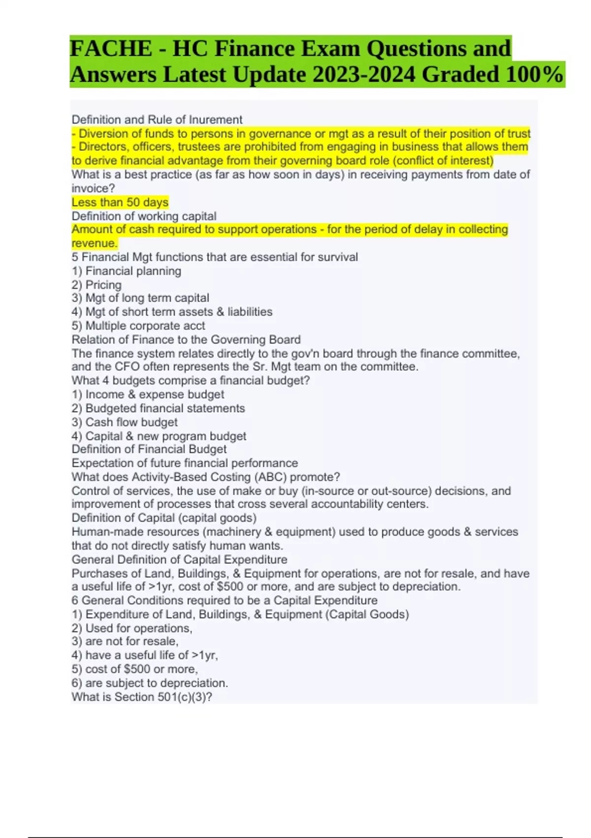 FACHE Board of Governor’s Exam Questions and Answers Latest Update 2024 (Graded A+) Definition of working capital Amount of cash required to support operations - for the period of delay in collecting revenue. 5 Financial Mgt functions that are essential for survival 1) Financial planning 2) Pricing 3) Mgt of long term capital 4) Mgt of short term assets & liabilities 5) Multiple corporate acct Relation of Finance to the Governing Board The finance system relates directly to the gov'n board through the finance committee, and the CFO often represents the Sr. Mgt team on the committee. What 4 budgets comprise a financial budget? 1) Income & expense budget 2) Budgeted financial statements 3) Cash flow budget 4) Capital & new program budget Definition of Financial Budget Expectation of future financial performance What does Activity-Based Costing (ABC) promote? Control of services, the use of make or buy (in-source or out-source) decisions, and improvement of processes that cross several accountability centers. Definition of Capital (capital goods) Human-made resources (machinery & equipment) used to produce goods & services that do not directly satisfy human wants. General Definition of Capital Expenditure Purchases of Land, Buildings, & Equipment for operations, are not for resale, and have a useful life of >1yr, cost of $500 or more, and are subject to depreciation. 6 General Conditions required to be a Capital Expenditure 1) Expenditure of Land, Buildings, & Equipment (Capital Goods) 2) Used for operations, 3) are not for resale, 4) have a useful life of >1yr, 5) cost of $500 or more, 6) are subject to depreciation. What is Section 501(c)(3)? FACHE - HC Finance Exam Questions and Answers Latest Update Graded 100% Section of the IRS Code that makes a HCO tax-exempt 00:0201:38 What are 2 Ratios that measure the ability to pay current liabilities? 1) Current Ratio 2) Acid Test (aka Quick) Ratio What are 3 Ratios used to measure ability to sell inventory and collect receivables? 1) Inventory Turnover ratio 2) A/R Turnover ratio 3) Day's Sales in Receivables ratio What are 2 Ratios used to measure ability to pay long-term debt? 1) Debt Ratio 2) Time-Interest-Earned Ratio What are 4 Ratios used to measure Profitability? 1) Rate of Return on Net Sales ratio 2) Rate of Return on Total Assets ratio 3) Rate of Return on Common Stockholder's Equity ratio 4) Earnings Per Share of Common Stock ratio What are 3 Ratios to analyze Stock as an investment? 1) Price-Earning's ratio 2) Divident Yield ratio 3) Book value per share of common stock What is the Current Ratio Formula? = (Current Assets) / (Current Liabilities) > Measures ability to pay current liabilities from current assets > The higher the ratio, the better; (want numerator to be larger than the denominator, indicates stronger financial position) What is the Acid Test (aka Quick) Ratio Formula? = (Cash+Short-term investments+Net current receivables) / Current Liabilities > Shows ability to pay current liabilities from the most liquid assets > Tells whether the organization can pay all its current liabilities if they come due asap > In other words, how quickly can a HCO convert its most liquid assets to cash to pay current liabilities > The higher the better; indicates enough (if not more) current assets to cover current liabilities What is the Inventory Turnover Formula? = (Cost of Good Sold) / Avg Inventory (at cost) for the Period > Indicates saleability of inventory > Measures the # of times a company sells its avg level of inventory in a given period. > The higher the ratio, the better; means relative ease in selling inventory (want the numerator to be larger than the denominator) What is the A/R Turnover ratio formula? = (Net Credit Sales) / Avg Net A-R > Measures collectibility of receivables; ability to collect cash from credit customers What is the Day's Sales in Receivables ratio Formula? = (Avg Net A-R) / (One day's sales) > Shows how many days it takes to collect avg receivables What is the Debt Ratio Formula? = (Total Liabilities) / (Total Assets) > Indicates % of assets financed through borrowing What is the Time-Interest-Earned Ratio Formula? = (Income from Operations) / (Interest Expense) > Measures coverage of interest expense by operating income What is the Rate of Return on Net Sales ratio Formula? = (Net Income) / (Net Sales) > Shows % of each sales dollar earned as net income What is the Rate of Return on Total Assets ratio Formula? = (Net Income+Interest Expense) / (Avg Total Assets) > Gauges how profitably assets are used > Net Income (for Investors) & Interest Expense (for HCO's Creditors) are the two Return-on-Assets measures. What is the Rate of Return on Common Stockholder's Equity ratio Formula? = (Net Income - Preferred dividends) / (Avg Common Stockholder's Equity) > Gauges how profitably the assets financed by the common stockholders are used. What is the Earnings Per Share of Common Stock ratio Formula? = (Net Income - Preferred Dividends) / (# of shares of common stock outstanding) > Gives the amt of earnings per one share of common stock. What is the Price-Earning's ratio Formula? = (Mkt price per share of common stock) / Earnings per share > Indicates the mkt price of $1 of earnings What is the Operating Cycle of a Merchandiser? Cash --> Inventory --> Receivables --> Cash
