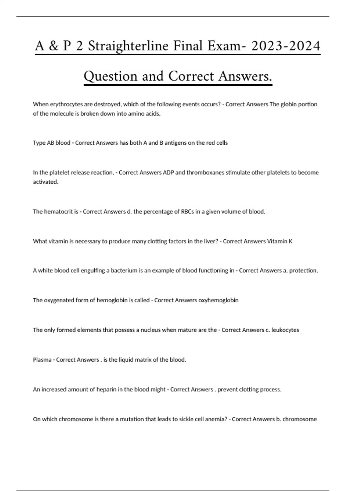 When erythrocytes are destroyed, which of the following events occurs? - Correct Answers The globin portion of the molecule is broken down into amino acids. Type AB blood - Correct Answers has both A and B antigens on the red cells In the platelet release reaction, - Correct Answers ADP and thromboxanes stimulate other platelets to become activated. The hematocrit is - Correct Answers d. the percentage of RBCs in a given volume of blood. What vitamin is necessary to produce many clotting factors in the liver? - Correct Answers Vitamin K A white blood cell engulfing a bacterium is an example of blood functioning in - Correct Answers a. protection. The oxygenated form of hemoglobin is called - Correct Answers oxyhemoglobin The only formed elements that possess a nucleus when mature are the - Correct Answers c. leukocytes Plasma - Correct Answers . is the liquid matrix of the blood. An increased amount of heparin in the blood might - Correct Answers . prevent clotting process. On which chromosome is there a mutation that leads to sickle cell anemia? - Correct Answers b. chromosome 11 Blood consists of a matrix of plasma and cells; blood is a subtype of ______ tissue. - Correct Answers e. connective The ability of white blood cells to leave the circulation and enter tissues is called - Correct Answers b. diapedesis. The nervous system and certain chemicals can cause the constriction of a blood vessel. This is known as - Correct Answers b. vascular spasm The cascade of events in the intrinsic pathway can be set into motion when _____ comes into contact with collagen. - Correct Answers factor XII If a blood buffer is absent, what function of the blood would be compromised? - Correct Answers regulation of pH What is tissue thromboplastin? - Correct Answers A compound released by damaged tissue that initiates the extrinsic clotting pathway A deficiency of which of the following stem cells would result in a marked increase in the clotting time of blood? - Correct Answers megakaryoblast Macrophages are derived from - Correct Answers monocytes Which of the following events is one of the three main stages of coagulation? - Correct Answers conversion of fibrinogen to fibrin The "pacemaker" of the heart is the - Correct Answers SA node Where is blood moving during the period of ejection? - Correct Answers Ventricles to great vessels The adult heart averages ___________ grams. - Correct Answers 250-300 The epicardium - Correct Answers covers the surface of the heart. Energy for contraction of myocardial cells comes primarily from - Correct Answers aerobic respiration in the mitochondria What event(s) occur during the QRS complex of an ECG? - Correct Answers depolarization of the ventricles and repolarization of the atria The relationship between preload and stroke volume is known as - Correct Answers Starling Law of the heart. Cardiac muscle cells - Correct Answers are maintained by an extensive capillary network. During the isovolumetric contraction period of the cardiac cycle, - Correct Answers AV and semilunar valves are closed. Pressure in the right ventricle must exceed pressure in the ____ before the right ventricle can eject blood. - Correct Answers pulmonary trunk In the cardiac cycle, - Correct Answers all four chambers of the heart are in diastole at the same time. What cardiac arrhythmia will have no QRS complex as a symptom? - Correct Answers ventricular fibrillation Which of the following is administered to the people suffering from myocardial infarction following onset of symptoms? - Correct Answers Tissue plasminogen activator (t-PA) Which of the following might increase the risk for cardiovascular disease? - Correct Answers chronic stress Aortic stenosis results from - Correct Answers a narrowed opening through the aortic valve An incompetent pulmonary semilunar valve could result in less blood reaching the - Correct Answers lungs A patient has been diagnosed with mild heart disease. Tests show that some of the coronary arteries are partially occluded. Which of the following is the best course of action to treat the disease? - Correct Answers Angioplasty Angina pectoris is chest pain caused by reduced - Correct Answers blood supply to cardiac muscle. Coronary artery disease can diminish myocardial blood flow resulting in the death of myocardial cells. This condition is known as a myocardial - Correct Answers infarction What abnormal heart rhythm could be caused by an elevated body temperature, excessive sympathetic stimulation, or toxic conditions? - Correct Answers tachycardia Which type of vessel has the greatest compliance? - Correct Answers veins Which of the following thoracic organs is supplied by a parietal branch of the thoracic aorta? - Correct Answers the intercostal muscles Increased pressure in the aortic arch will activate the aortic arch reflex and cause - Correct Answers increased parasympathetic stimulation of the heart. According to Poiseuille's law, - Correct Answers if resistance increases, flow decreases The vein that ascends along the medial side of the lower limb to the femoral vein is the ____ saphenous vein and the vein that ascends along the posterior aspect of the leg to the popliteal vein is the _____ saphenous vein. - Correct Answers great; small If someone has a blood pressure reading of 110/70 mm Hg, their pulse pressure would be - Correct Answers 40 mm Hg. What is the most important means by which capillary exchange occurs? - Correct Answers diffusion Which of the following statements about laminar blood flow is true? - Correct Answers The outermost layer of blood experiences the greatest resistance to flow. In capillary exchange, which of the following statements is true? - Correct Answers Most fluid that leaves the arterial end of a capillary reenters the venous end of a capillary. The exchange of nutrients and gases between the blood and tissue cells is the primary function of - Correct Answers capillaries. Resistance to blood flow is greatest in - Corr