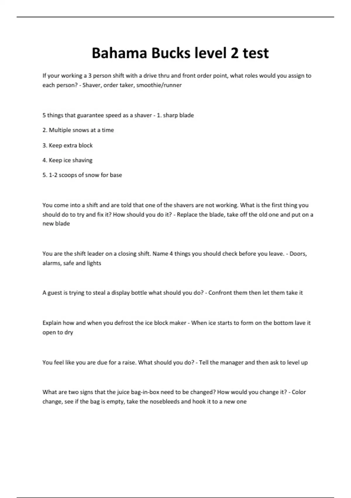 If your working a 3 person shift with a drive thru and front order point, what roles would you assign to each person? - Shaver, order taker, smoothie/runner 5 things that guarantee speed as a shaver - 1. sharp blade 2. Multiple snows at a time 3. Keep extra block 4. Keep ice shaving 5. 1-2 scoops of snow for base You come into a shift and are told that one of the shavers are not working. What is the first thing you should do to try and fix it? How should you do it? - Replace the blade, take off the old one and put on a new blade You are the shift leader on a closing shift. Name 4 things you should check before you leave. - Doors, alarms, safe and lights A guest is trying to steal a display bottle what should you do? - Confront them then let them take it Explain how and when you defrost the ice block maker - When ice starts to form on the bottom lave it open to dry You feel like you are due for a raise. What should you do? - Tell the manager and then ask to level up What are two signs that the juice bag-in-box need to be changed? How would you change it? - Color change, see if the bag is empty, take the nosebleeds and hook it to a new one 5 things you can do to offer great jest services - 1. Greetings 2. Be respectful 3. Guest service 4. Have fun 5. Know your stuff While you are working you notice another crew member giving away free product. What should you do? - Confront the employee in a private area and then inform the manager When we close at night to we leave the cash drawers open or closed? Why? - Open so when people who look in see there's no money in the drawers Describe how to make and serve the perfect Island Smoothie - Use clean blender, put in ingredients, blend, pour, whip and cherry, lid, quarter wrapped straw and wipe down the cup You and a seasoned crew member are scheduled for a shift on Friday night. You get a call earlier on in the week from a special someone you've been eyeing that is asking you on a date. Describe the process you should take to get that shift covered. - Ask someone if they can take it and then inform the manager A crew member cuts their hand while on shift and needs stitches. What is your immediate response? Where should you send the employee? What should you do after the employee is take care of? - If you cant stop the bleeding then take them to rapid med. Inform the manager of the situation Name 3 things you know are health code violations - 1. Hair down 2. Not washing hands 3. Not wearing gloves while making snow cones BONUS: if you were the manger for one day, what 3 things would you like to change in order to improve the shop. - 1. Wear leggings