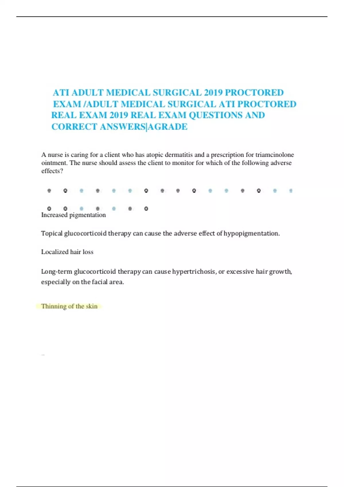 ATI ADULT MEDICAL SURGICAL 2019 PROCTORED EXAM /ADULT MEDICAL SURGICAL ATI PROCTORED REAL EXAM 2019 REAL EXAM QUESTIONS AND CORRECT ANSWERS|AGRADE A nurse is caring for a client who has atopic dermatitis and a prescription for triamcinolone ointment. Th