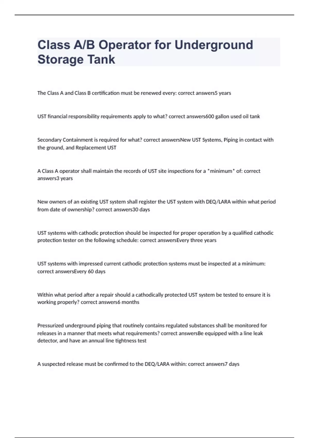 The Class A and Class B certification must be renewed every: correct answers5 years UST financial responsibility requirements apply to what? correct answers600 gallon used oil tank Secondary Containment is required for what? correct answersNew UST Systems, Piping in contact with the ground, and Replacement UST A Class A operator shall maintain the records of UST site inspections for a *minimum* of: correct answers3 years New owners of an existing UST system shall register the UST system with DEQ/LARA within what period from date of ownership? correct answers30 days UST systems with cathodic protection should be inspected for proper operation by a qualified cathodic protection tester on the following schedule: correct answersEvery three years UST systems with impressed current cathodic protection systems must be inspected at a minimum: correct answersEvery 60 days Within what period after a repair should a cathodically protected UST system be tested to ensure it is working properly? correct answers6 months Pressurized underground piping that routinely contains regulated substances shall be monitored for releases in a manner that meets what requirements? correct answersBe equipped with a line leak detector, and have an annual line tightness test A suspected release must be confirmed to the DEQ/LARA within: correct answers7 days
