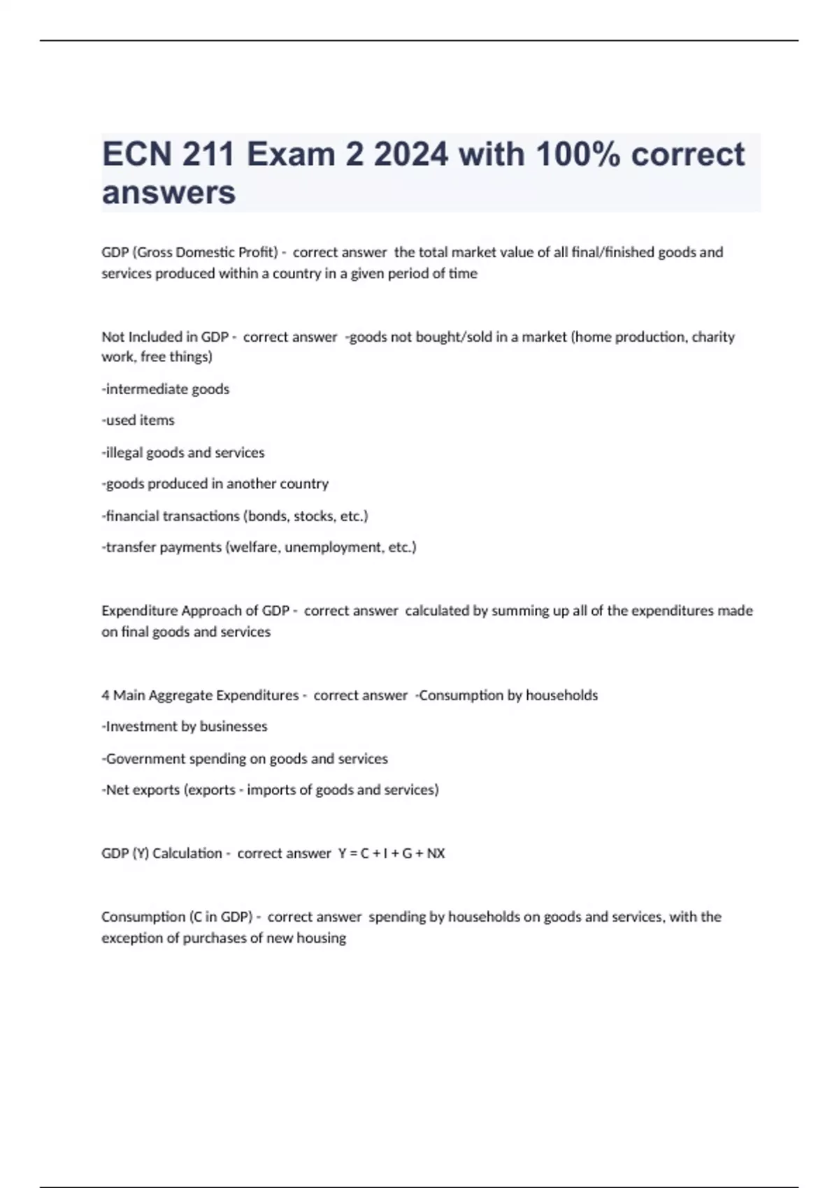 GDP (Gross Domestic Profit) - correct answer the total market value of all final/finished goods and services produced within a country in a given period of time Not Included in GDP - correct answer -goods not bought/sold in a market (home production, charity work, free things) -intermediate goods -used items -illegal goods and services -goods produced in another country -financial transactions (bonds, stocks, etc.) -transfer payments (welfare, unemployment, etc.) Expenditure Approach of GDP - correct answer calculated by summing up all of the expenditures made on final goods and services 4 Main Aggregate Expenditures - correct answer -Consumption by households -Investment by businesses -Government spending on goods and services -Net exports (exports - imports of goods and services) GDP (Y) Calculation - correct answer Y = C + I + G + NX Consumption (C in GDP) - correct answer spending by households on goods and services, with the exception of purchases of new housing Investment (I in GDP) - correct answer -the purchase of goods that will be used in the future to produce more goods and services -the s