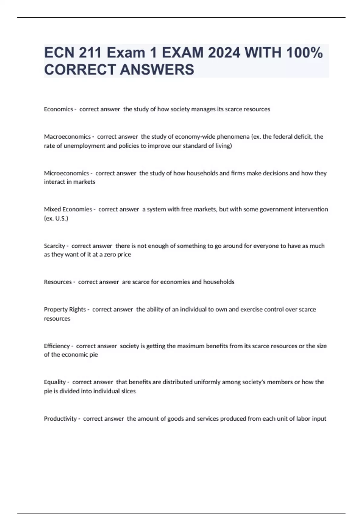 Economics - correct answer the study of how society manages its scarce resources Macroeconomics - correct answer the study of economy-wide phenomena (ex. the federal deficit, the rate of unemployment and policies to improve our standard of living) Microeconomics - correct answer the study of how households and firms make decisions and how they interact in markets Mixed Economies - correct answer a system with free markets, but with some government intervention (ex. U.S.) Scarcity - correct answer there is not enough of something to go around for everyone to have as much as they want of it at a zero price Resources - correct answer are scarce for economies and households Property Rights - correct answer the ability of an individual to own and exercise control over scarce resources Efficiency - correct answer society is getting the maximum benefits from its scarce resources or the size of the economic pie Equality - correct answer that benefits are distributed uniformly among society's members or how the pie is divided into individual slices Productivity - correct answer the amount of goods and services produced from each unit of labor input I