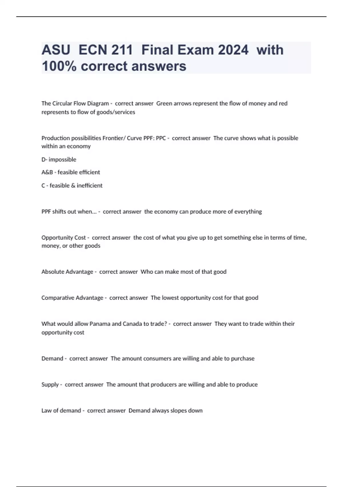 The Circular Flow Diagram - correct answer Green arrows represent the flow of money and red represents to flow of goods/services Production possibilities Frontier/ Curve PPF: PPC - correct answer The curve shows what is possible within an economy D- impossible A&B - feasible efficient C - feasible & inefficient PPF shifts out when... - correct answer the economy can produce more of everything Opportunity Cost - correct answer the cost of what you give up to get something else in terms of time, money, or other goods Absolute Advantage - correct answer Who can make most of that good Comparative Advantage - correct answer The lowest opportunity cost for that good What would allow Panama and Canada to trade? - correct answer They want to trade within their opportunity cost Demand - correct answer The amount consumers are willing and able to purchase Supply - correct answer The amount that producers are willing and able to produce Law of demand - correct answer Demand always slopes down La