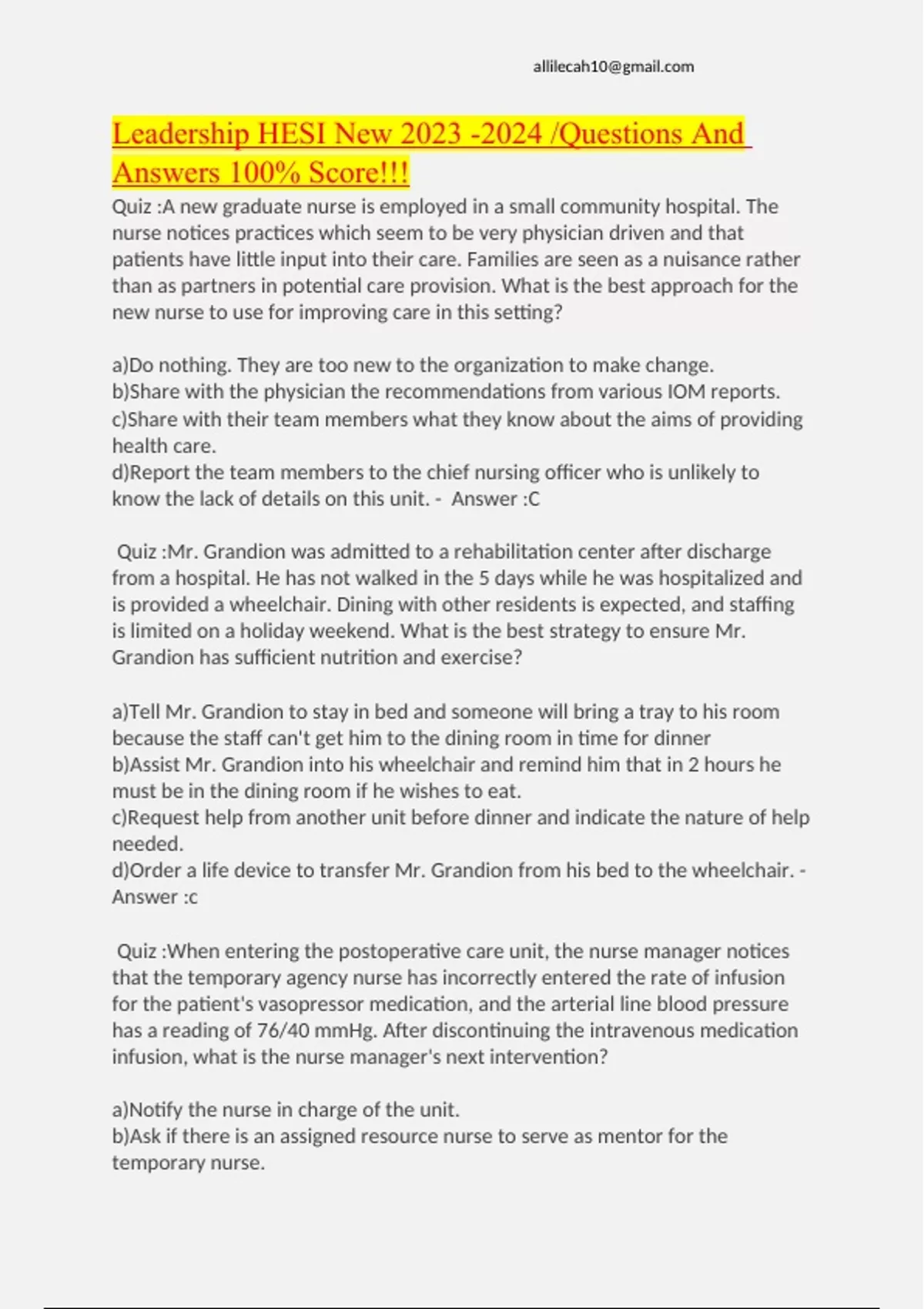 Hesi leadership EXAM QUESTIONS & ANSWERS/ LATEST UPDATE / RATED A+