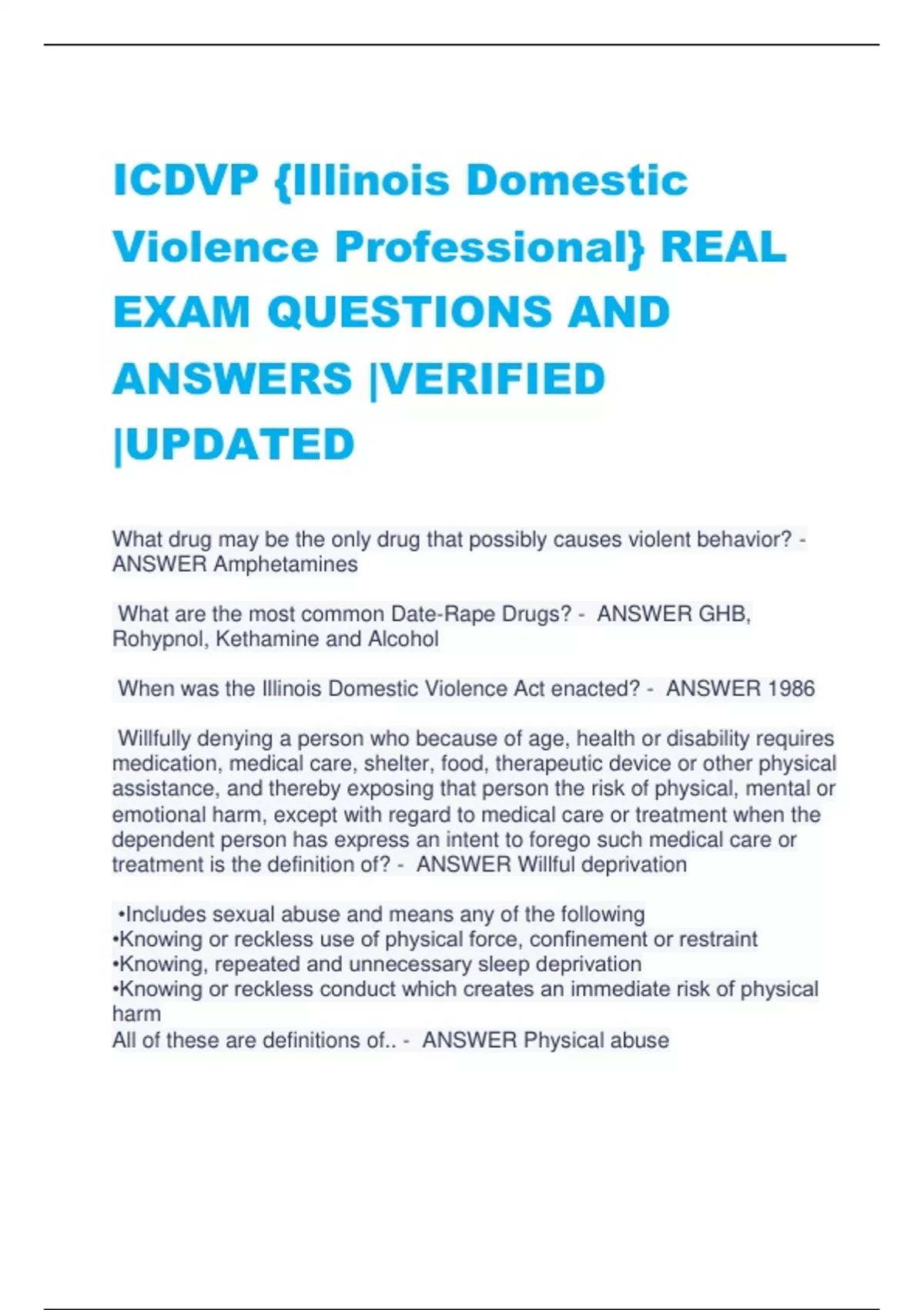 ICDVP {Illinois Domestic Violence Professional} REAL EXAM QUESTIONS AND ANSWERS |VERIFIED |UPDATED