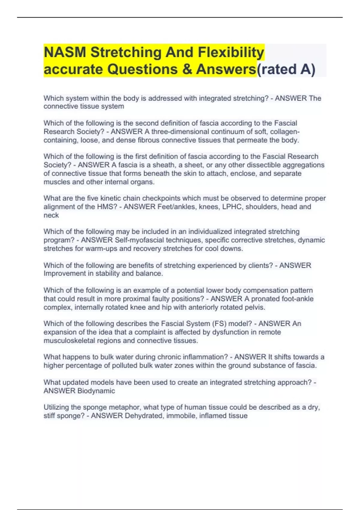 NASM SNASM Stretching And Flexibility accurate Questions & Answers(rated A)tretching And Flexibility accurate Questions & ANASM Stretching And Flexibility accurate Questions & Answers(rated A)nswers(rated A)