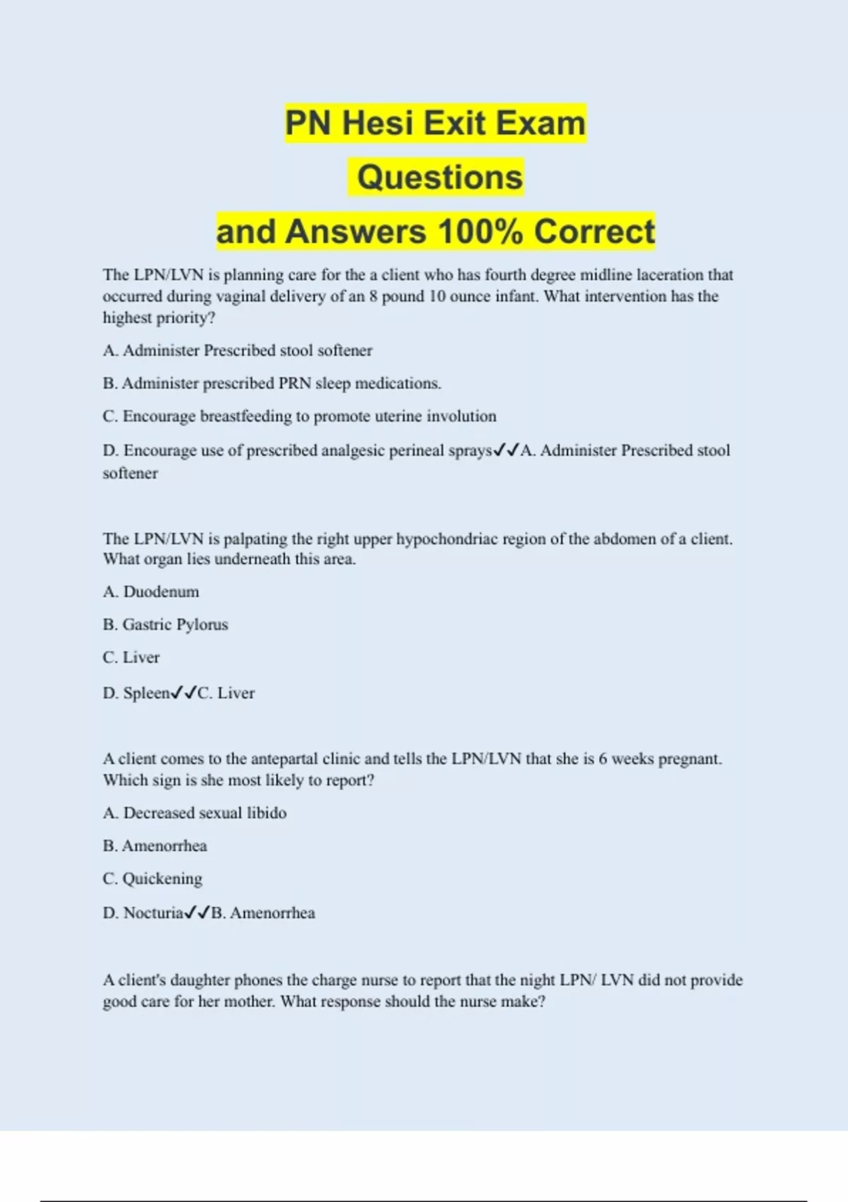 The LPN/LVN is planning care for the a client who has fourth degree midline laceration that occurred during vaginal delivery of an 8 pound 10 ounce infant. What intervention has the highest priority? A. Administer Prescribed stool softener B. Administer prescribed PRN sleep medications. C. Encourage breastfeeding to promote uterine involution D. Encourage use of prescribed analgesic perineal spraysA. Administer Prescribed stool softener The LPN/LVN is palpating the right upper hypochondriac region of the abdomen of a client. What organ lies underneath this area. A. Duodenum B. Gastric Pylorus C. Liver D. SpleenC. Liver A client comes to the antepartal clinic and tell