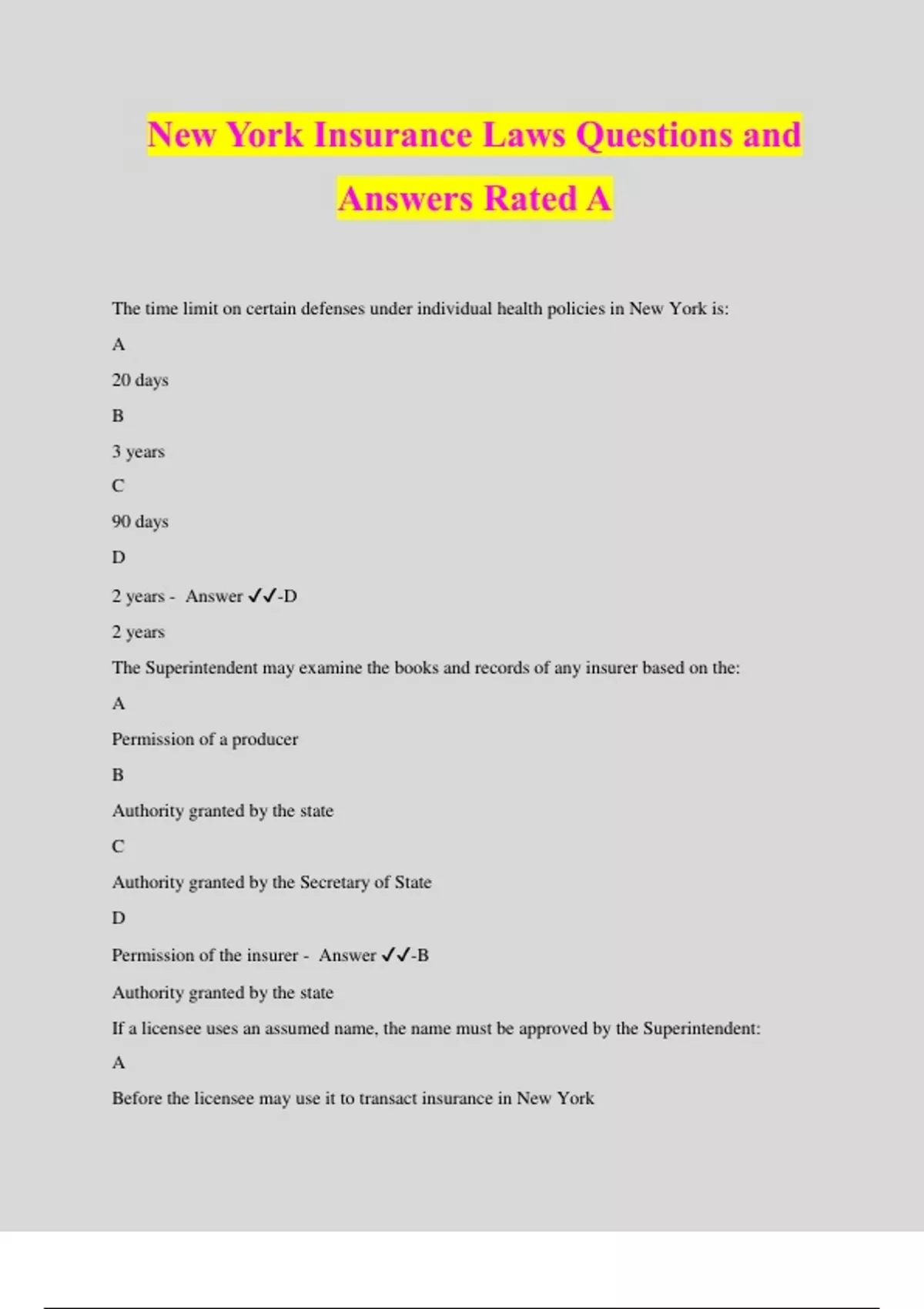 New York Insurance Laws Questions and Answers Rated A