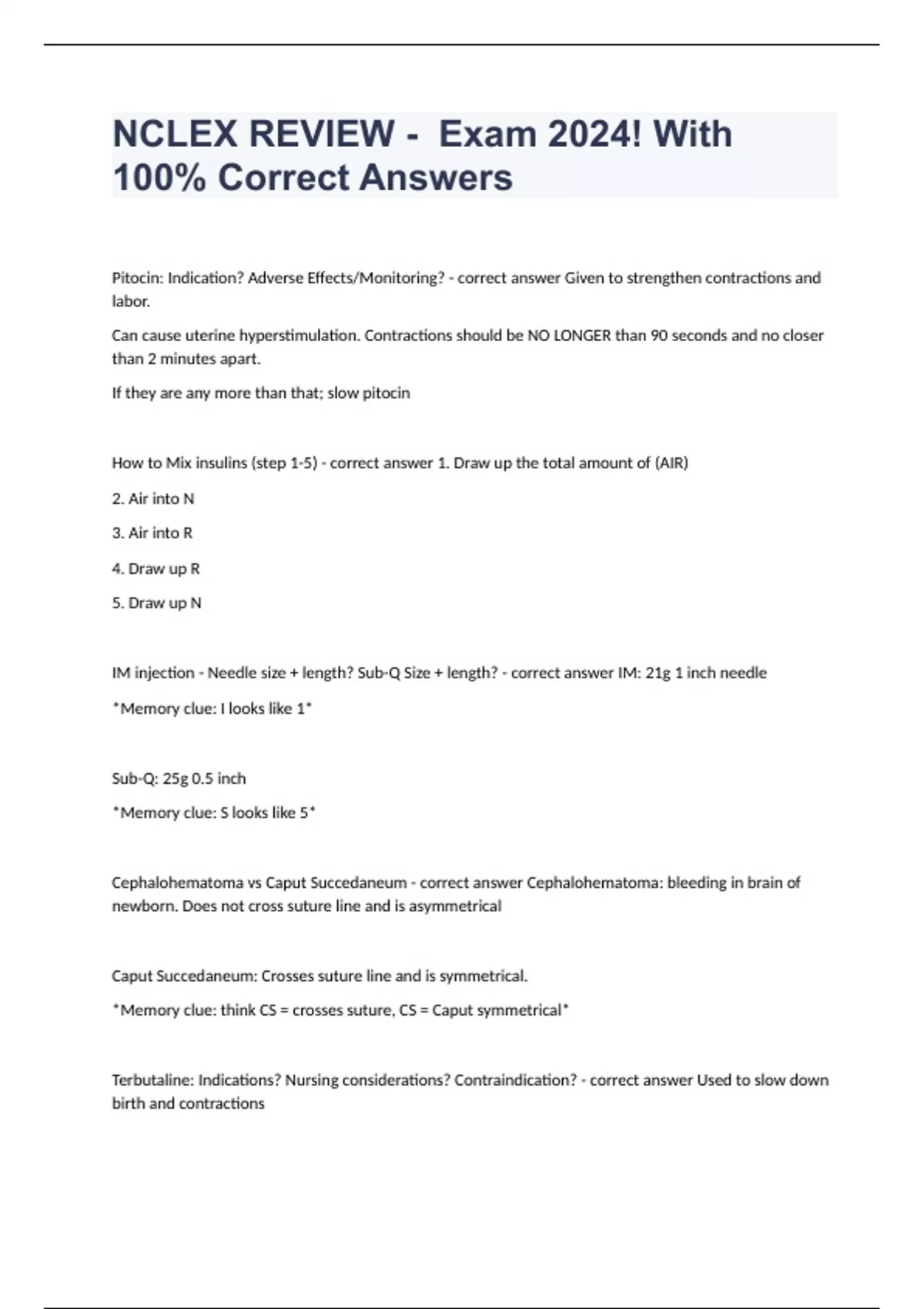 Pitocin: Indication? Adverse Effects/Monitoring? - correct answer Given to strengthen contractions and labor. Can cause uterine hyperstimulation. Contractions should be NO LONGER than 90 seconds and no closer than 2 minutes apart. If they are any more than that; slow pitocin How to Mix insulins (step 1-5) - correct answer 1. Draw up the total amount of (AIR) 2. Air into N 3. Air into R 4. Draw up R 5. Draw up N IM injection - Needle size + length? Sub-Q Size + length? - correct answer IM: 21g 1 inch needle *Memory clue: I looks like 1* Sub-Q: 25g 0.5 inch *Memory clue: S looks like 5* Cephalohematoma vs Caput Succedaneum - correct answer Cephalohematoma: bleeding in brain of newborn. Does not cross suture line and is asymmetrical Caput Succedaneum: Crosses suture line and is symmetrical. *Memory clue: think CS = crosses suture, CS = Caput symmetrical* Terbutaline: Indications? Nursing considerations? Contraindication? - correct answer Used to slow down birth and contractions Contraindicated: in mothers with heart disease due to its common side effect of tachycardia Fundal Height - Postpartum: Height right after birth? Everyday after that? - correct answer Fundal height right after birth is at the umbilicus - Every day after birth it will go down by 1, height correlates with the day postpartum Put the following tracheostomy care steps in order: - Remove old dressing - clean around stoma w/ sterile water or saline then replace gauze - Don sterile gloves, remove old disposable inner cannula and replace with new one - Collect supplies and position patient - Don PPE - correct answer 1. Collect supplies and position patient 2. Don PPE 3. Remove old dressing 4. DON sterile gloves and remove old disposable inner cannula then replace with new one 5. Clean around stoma with sterile water or saline then replace gauz Second stage of labor (delivery): Place steps in order for delivering BB. - Make sure baby has an ID before leaving delivery area - Suction babies mouth then nose - Deliver shoulder then body - Check for nuchal cord - Deliver babies head then tell mom to stop pushing - correct answer 1. Deliver babies head and tell mom to stop pushing 2. Suctions babies mouth then nose 3. Check for nuchal (cord around neck) around neck 4. Deliver shoulders then body 5. Make sure BB has ID before leaving delivery area