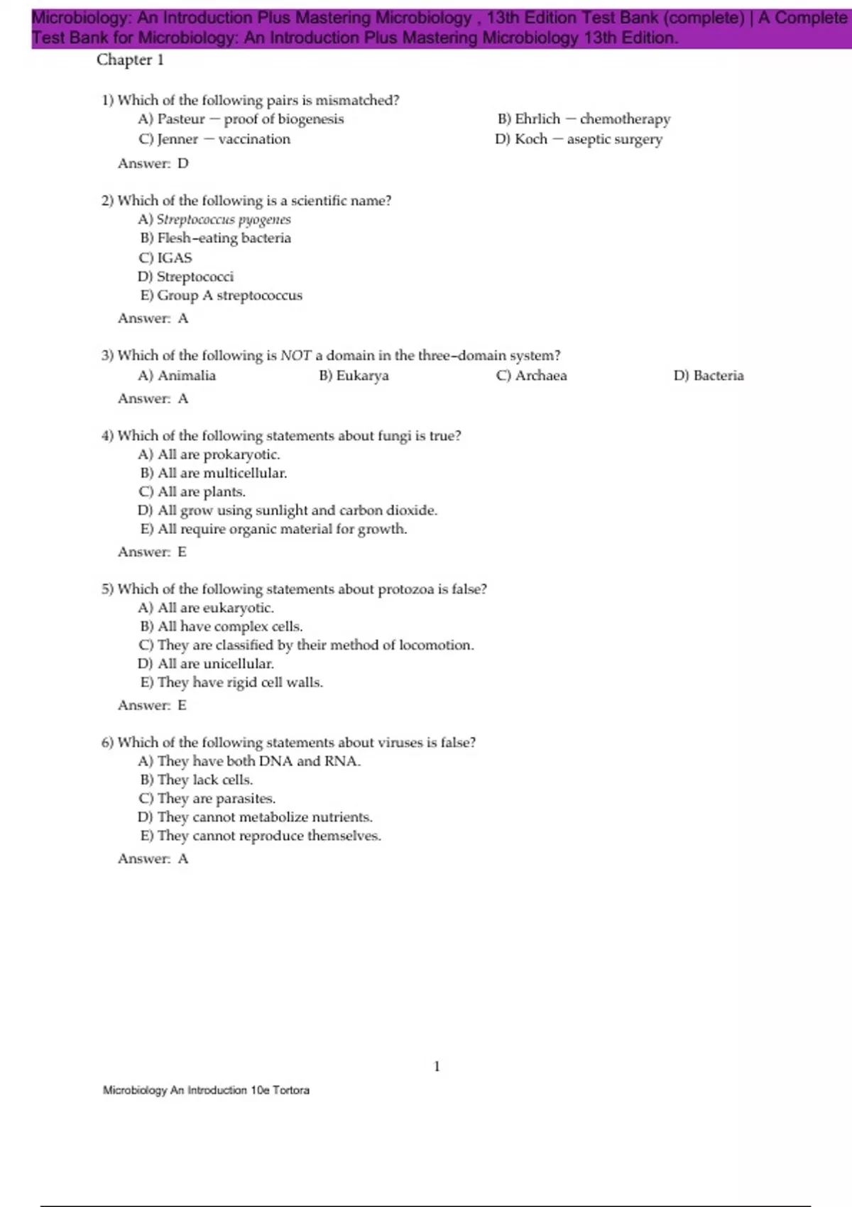 Microbiology: An Introduction Plus Mastering Microbiology , 13th Edition Test Bank (complete) | A Complete Test Bank for Microbiology: An Introduction Plus Mastering Microbiology 13th Edition 1) Which of the following pairs is mismatched? A) Pasteur proof of biogenesis B) Ehrlich chemotherapy C) Jenner vaccination D) Koch aseptic surgery Answer: D 2) Which of the following is a streptococcus Answer: A 3) Which of the following is NOT a domain in the three-domain system? A) Animalia B) Eukarya C) Archaea D) Bacteria Answer: A 4) Which of the following statements about fungi is true? A) All are prokaryotic. B) All are multicellular. C) All are plants. D) All grow using sunlight and carbon dioxide. E) All require organic material for growth. Answer: E 5) Which of the following statements about protozoa is false? A) All are eukaryotic. B) All have complex cells. C) They are classified by their method of locomotion. D) All are unicellular. E) They have rigid cell walls. Answer: E 6) Which of the following statements about viruses is false? A) They have both DNA and RNA. B) They lack cells. C) They are parasites. D) They cannot metabolize nutrients. E) They cannot reproduce themselves. Answer: A 1 Chapter 1 Microbiology An Introduction 10e Tortora Microbiology: An Introduction Plus Mastering Microbiology , 13th Edition Test Bank (complete) | A Complete Test Bank for Microbiology: An Introduction Plus Mastering Microbiology 13th Edition. 7) Regarding the experiments that "proved" spontaneous generation, which of the following statements is probably true? A) Microorganisms were already present. B) Air was lacking. C) Too much heat was applied. D) The food source could not support life. E) Excess carbon dioxide was present. Answer: A 8) Regarding Pasteur's experiments with the S-neck flask, which of the following statements is true? A) All microorganisms were killed before beginning. B) Any possibility of contamination was removed. C) There was air involved. D) There was a food source involved. E) All of the above. Answer: E 9) Which of the following statements about insect control by microorganisms is true? A) This technique is just as dangerous as the use of chemical pesticides. B) The insects develop resistance to the microorganisms. C) The microorganisms are specific for the insect pest. D) The microorganisms are permanent in the environment. E) The microorganisms may cause disease in other animals. Answer: C 10) Which of the following pairs is mismatched? A) Hooke cell theory B) van Leeuwenhoek germ theory C) Jenner vaccines D) Pasteur fermentation E) Lister aseptic surgery Answer: B 11) Who disproved the theory of spontaneous generation? A) Hooke B) Pasteur C) Koch D) Virchow E) van Leeuwenhoek Answer: B 12) Who observed cells in plant material? A) Koch B) Pasteur C) Lister D) Hooke E) van Leeuwenhoek Answer: D 2 Microbiology An Introduction 10e Tortora 13) Who was the first to observe microorganisms with a microscope? A) van Leeuwenhoek B) Pasteur C) Koch D) Weizmann E) Hooke Answer: A 14) Who proved that microorganisms cause disease? A) Semmelweis B) Koch C) Fleming D) Pasteur E) van Leeuwenhoek Answer: B 15) Which of the following is a scientific name? A) Leprosy bacterium B) Hansen's bacillus C) Acid-fast bacteria D) Mycobacterium leprae Answer: D 16) Classification of organisms in the three domains is based on A) Number of cells. B) Cell wall. C) Type of cell. D) Nutritional type. E) Nucleus. Answer: C 17) Which of the following statements is false? A) All viruses are parasites. B) All fungi are multicellular. C) All fungi have nuclear membranes. D) All bacteria lack nuclear membranes. E) All protozoa are unicellular. Answer: B 18) Which of the following statements is true? A) Protozoa have rigid cell walls. B) Fungi are plants. C) Bacteria cannot move. D) Viruses cannot reproduce outside a host cell. E) Algae are parasites. Answer: D 3 Microbiology An Introduction 10e Torto