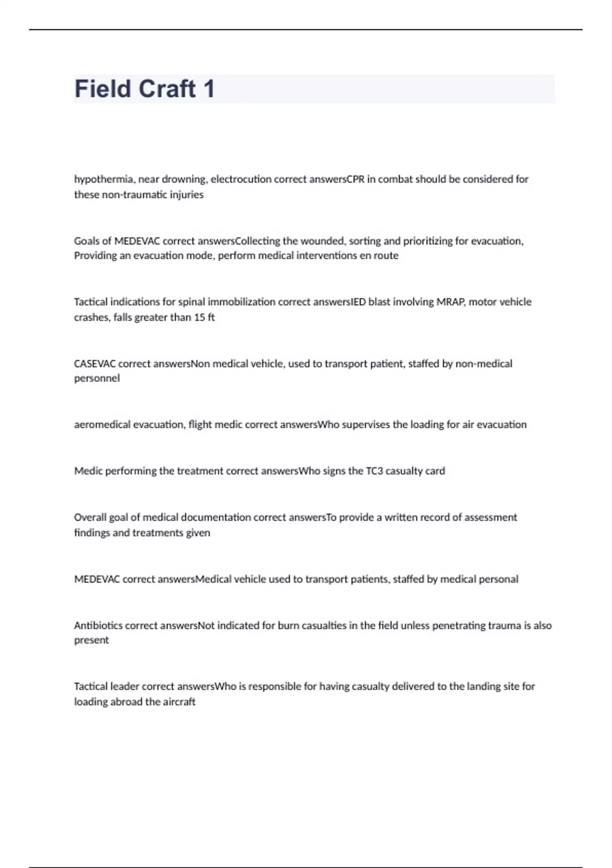 hypothermia, near drowning, electrocution correct answersCPR in combat should be considered for these non-traumatic injuries Goals of MEDEVAC correct answersCollecting the wounded, sorting and prioritizing for evacuation, Providing an evacuation mode, perform medical interventions en route Tactical indications for spinal immobilization correct answersIED blast involving MRAP, motor vehicle crashes, falls greater than 15 ft CASEVAC correct answersNon medical vehicle, used to transport patient, staffed by non-medical personnel aeromedical evacuation, flight medic correct answersWho supervises the loading for air evacuation Medic performing the treatment correct answersWho signs the TC3 casualty card Overall goal of medical documentation correct answersTo provide a written record of assessment findings and treatments given MEDEVAC correct answersMedical vehicle used to transport patients, staffed by medical personal Antibiotics correct answersNot indicated for burn casualties in the field unless penetrating trauma is also present Tactical leader correct answersWho is responsible for having casualty delivered to the landing site for loading abroad the aircraft