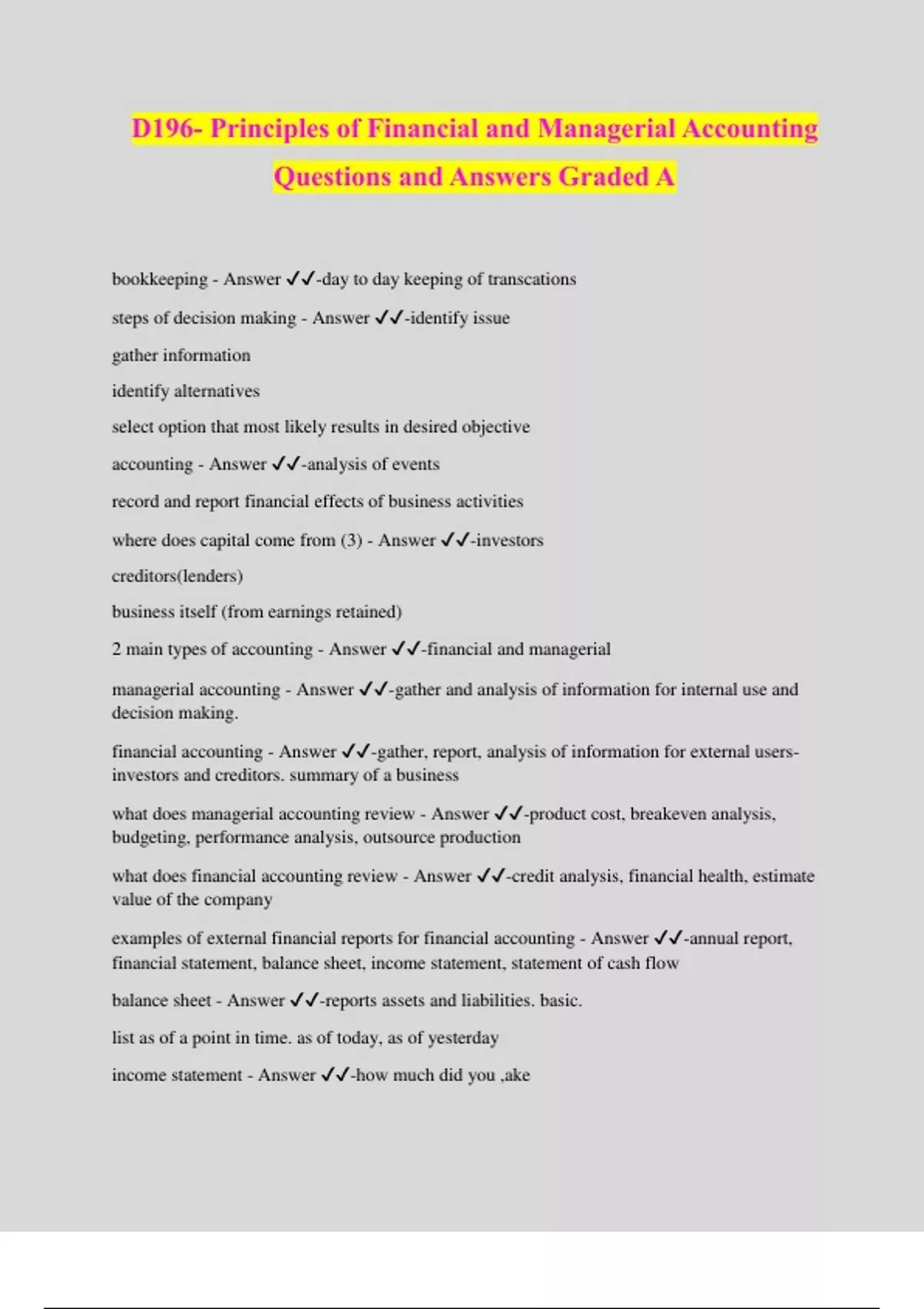 D196- Principles of Financial and Managerial Accounting Questions and Answers Graded A