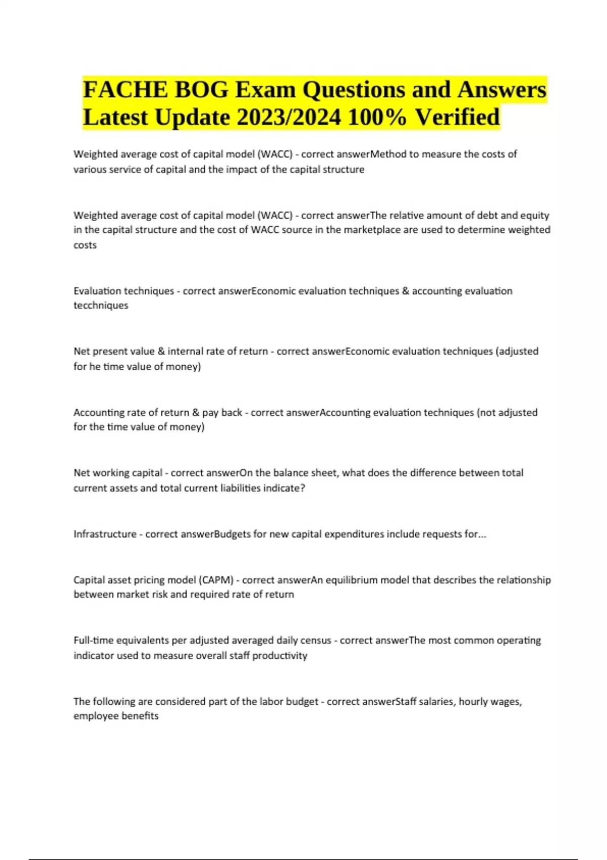 FACHE Board of Governor’s Exam Questions With Answers Latest Update 2024 (100% Verified) Weighted average cost of capital model (WACC) - correct answerMethod to measure the costs of various service of capital and the impact of the capital structure Weighted average cost of capital model (WACC) - correct answerThe relative amount of debt and equity in the capital structure and the cost of WACC source in the marketplace are used to determine weighted costs Evaluation techniques - correct answerEconomic evaluation techniques & accounting evaluation tecchniques Net present value & internal rate of return - correct answerEconomic evaluation techniques (adjusted for he time value of money) Accounting rate of return & pay back - correct answerAccounting evaluation techniques (not adjusted for the time value of money) Net working capital - correct answerOn the balance sheet, what does the difference between total current assets and total current liabilities indicate? Infrastructure - correct answerBudgets for new capital expenditures include requests for... Capital asset pricing model (CAPM) - correct answerAn equilibrium model that describes the relationship between market risk and required rate of return Full-time equivalents per adjusted averaged daily census - correct answerThe most common operating indicator used to measure overall staff productivity The following are considered part of the labor budget - correct answerStaff salaries, hourly wages, employee benefits FACHE BOG Exam Questions and Answers Latest Update 2023/2024 100% Verified Contract staff expenses - correct answerAre NOT considered part of the labor budget claim denial - correct answerClaim denial is a major impediment to prompt payment in the revenue cycle process FTE - correct answer20.8