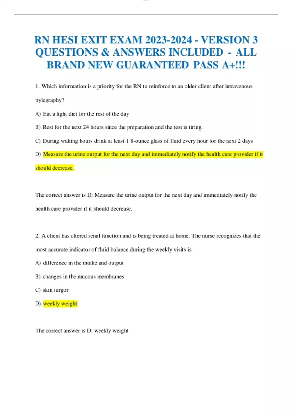 RN HESI EXIT EXAM - VERSION 3 QUESTIONS & ANSWERS INCLUDED - ALL BRAND NEW GUARANTEED PASS A+!!!