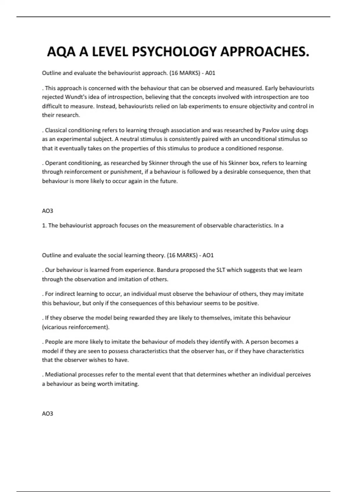 Outline and evaluate the behaviourist approach. (16 MARKS) - A01 . This approach is concerned with the behaviour that can be observed and measured. Early behaviourists rejected Wundt's idea of introspection, believing that the concepts involved with introspection are too difficult to measure. Instead, behaviourists relied on lab experiments to ensure objectivity and control in their research. . Classical conditioning refers to learning through association and was researched by Pavlov using dogs as an experimental subject. A neutral stimulus is consistently paired with an unconditional stimulus so that it eventually takes on the properties of this stimulus to produce a conditioned response. . Operant conditioning, as researched by Skinner through the use of his Skinner box, refers to learning through reinforcement or punishment, if a behaviour is followed by a desirable consequence, then that behaviour is more likely to occur again in the future. AO3 1. The behaviourist approach focuses on the measurement of observable characteristics. In a Outline and evaluate the social learning theory. (16 MARKS) - AO1 . Our behaviour is learned from experience. Bandura proposed the SLT which suggests that we learn through the observation and imitation of others. . For indirect learning to occur, an individual must observe the behaviour of others, they may imitate this behaviour, but only if the consequences of this behaviour seems to be positive. . If they observe the model being rewarded they are likely to themselves, imitate this behaviour (vicarious reinforcement). . People are more likely to imitate the behaviour of models they identify with. A person becomes a model if they are seen to possess characteristics that the observer has, or if they have characteristics that the observer wishes to have. . Mediational processes refer to the mental event that that determines whether an individual perceives a behaviour as being worth imitating. AO3
