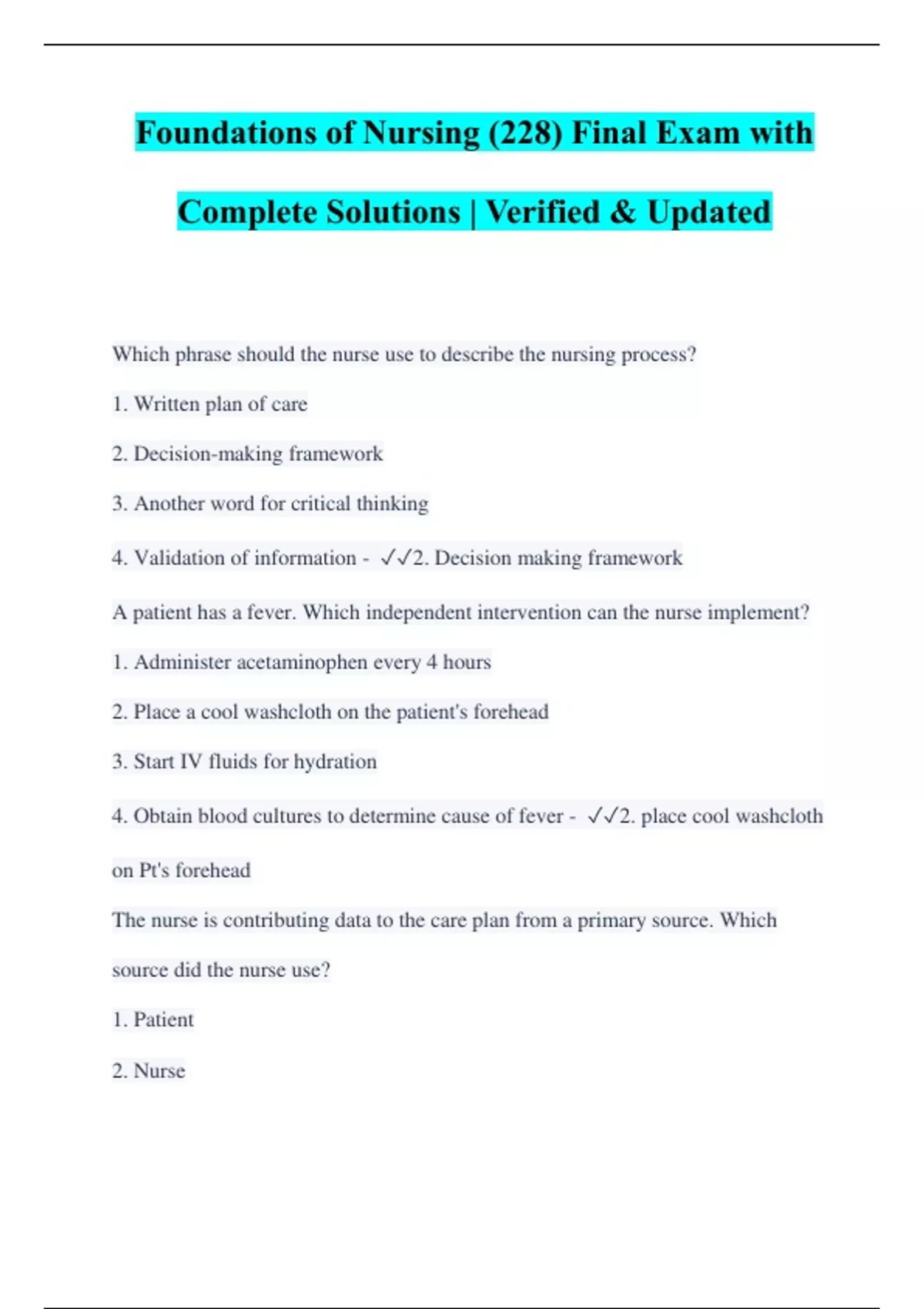 Foundations of Nursing (228) Final Exam with Complete Solutions | Verified & Updated