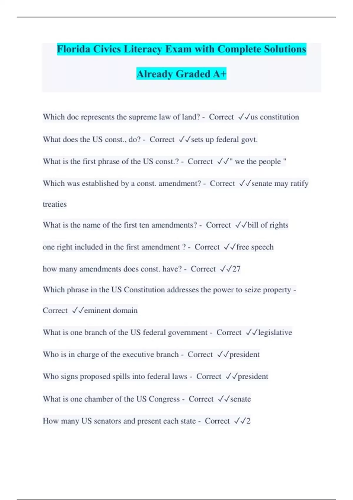 Florida Civics Literacy Exam with Complete Solutions Already Graded A+